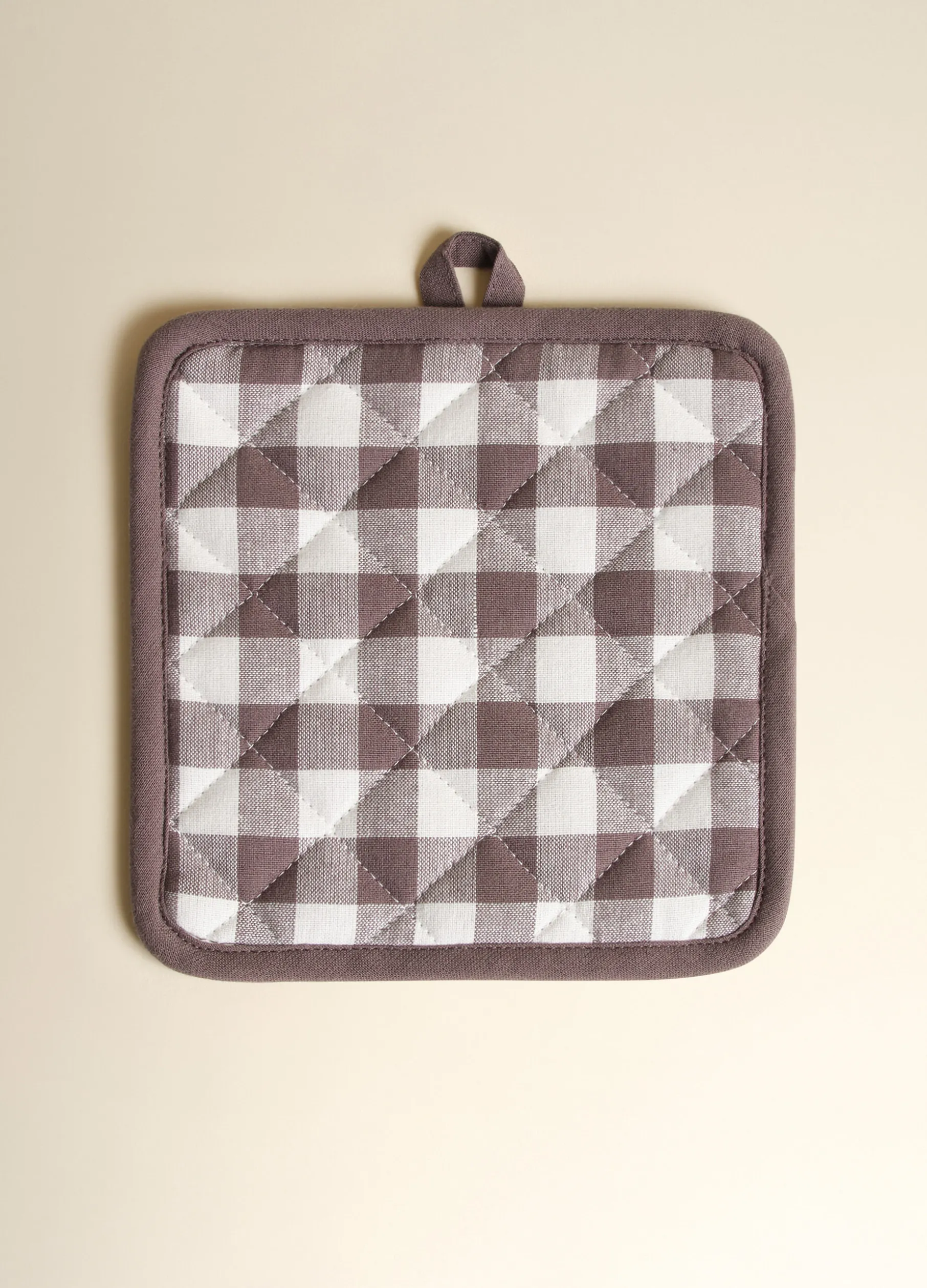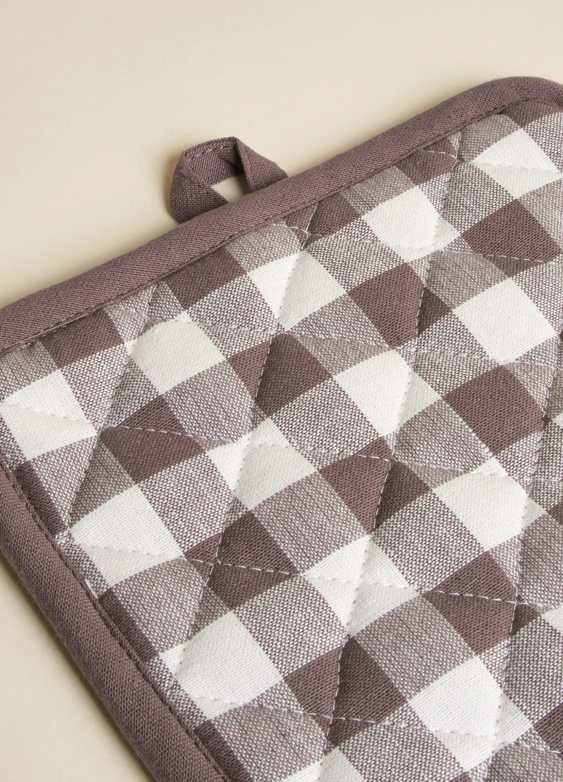 Presina da cucina quadrata in puro cotone, robusta e pratica da usare. Completata da un motivo a scacchi in bianco e marrone, oltre che da un profilo con gancetto in tonalità più scura.