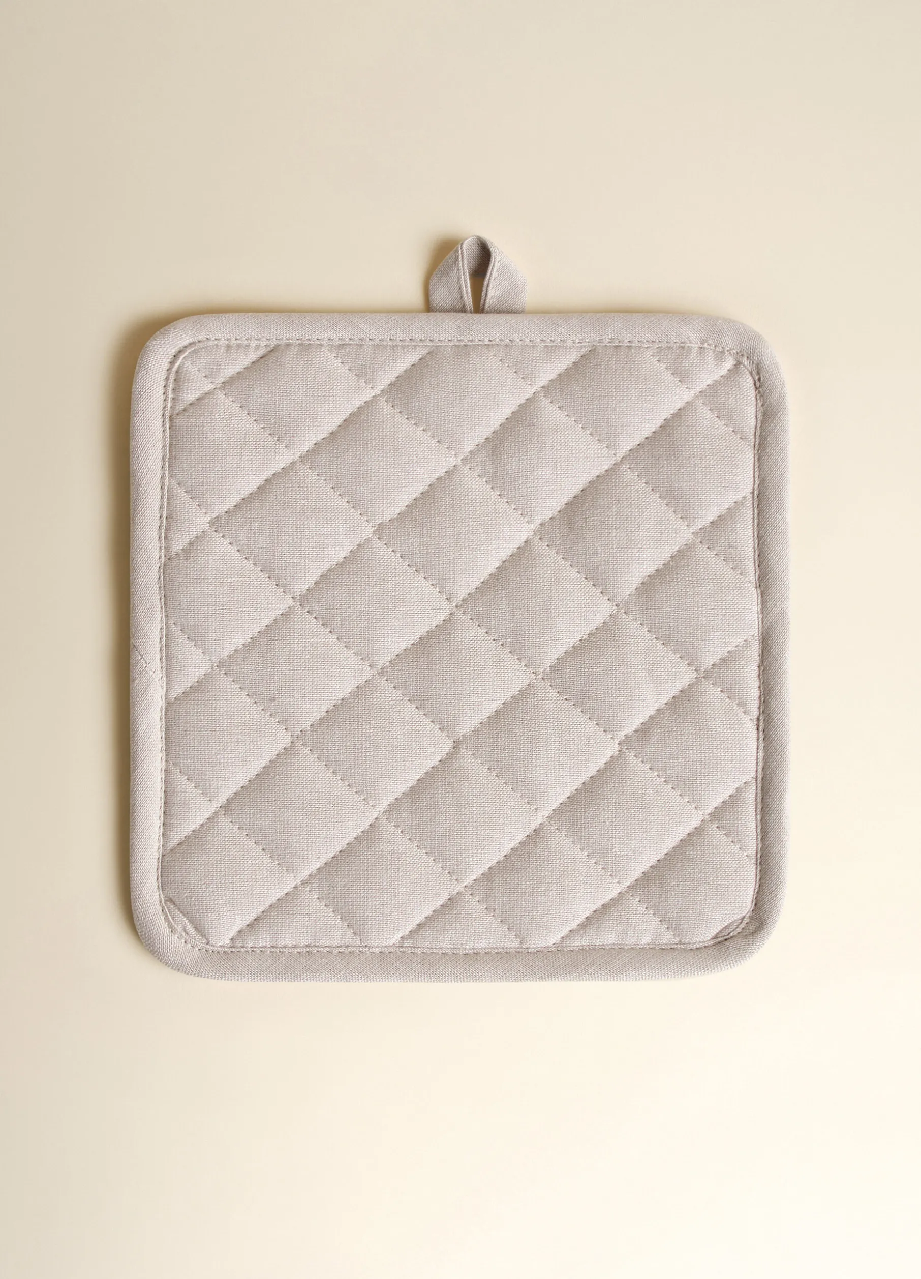 Presina quadrata da cucina realizzata in cotone beige mélange, resistente e versatile per l’uso quotidiano. Con orlo e gancetto in tinta unita e trapuntatura.