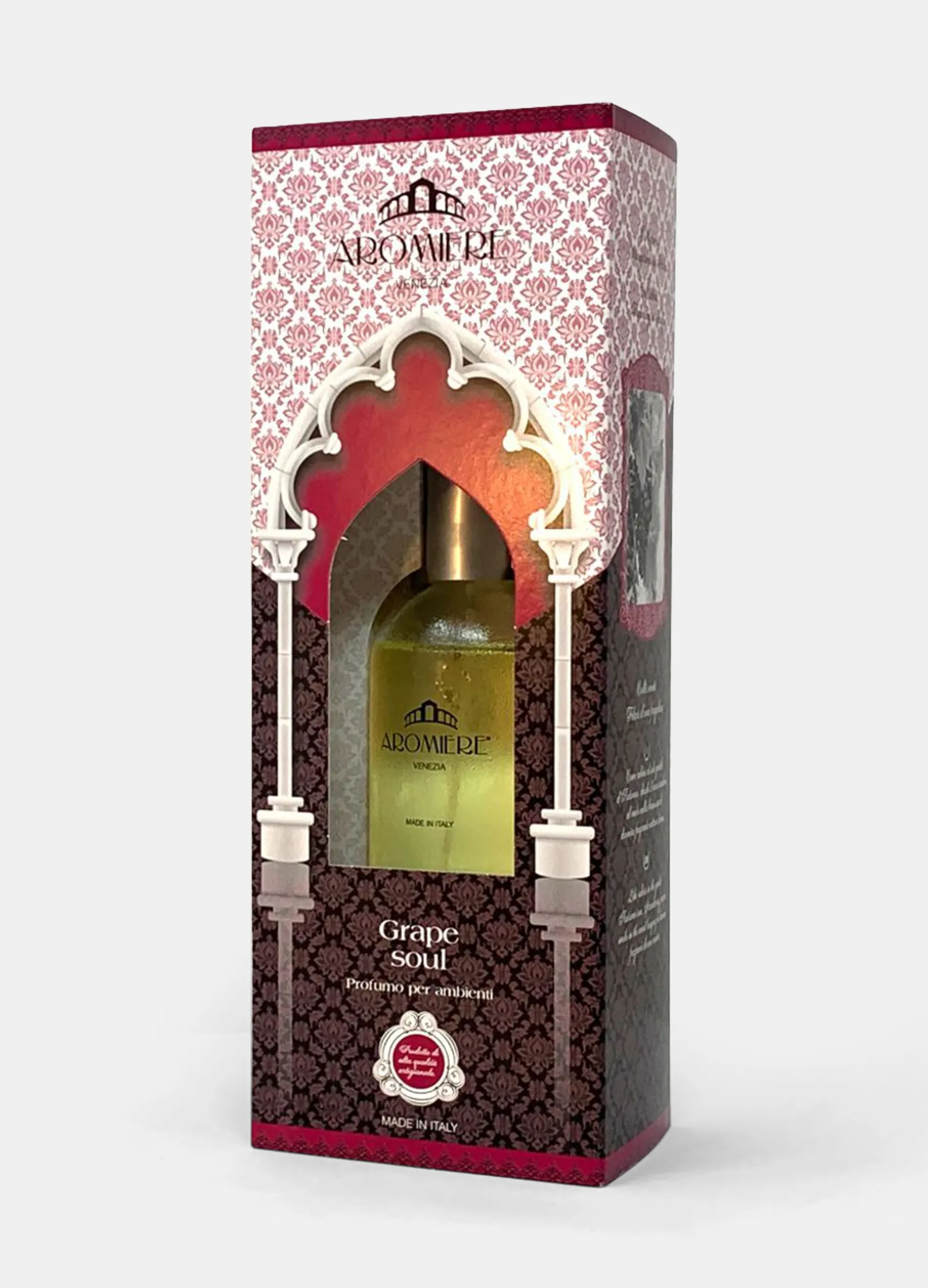 Profumo per ambienti spray Aromiere Venezia aroma “Grape soul”. Contenitore in vetro. Capacità 100ml. Altezza 25cm. Made in Italy.