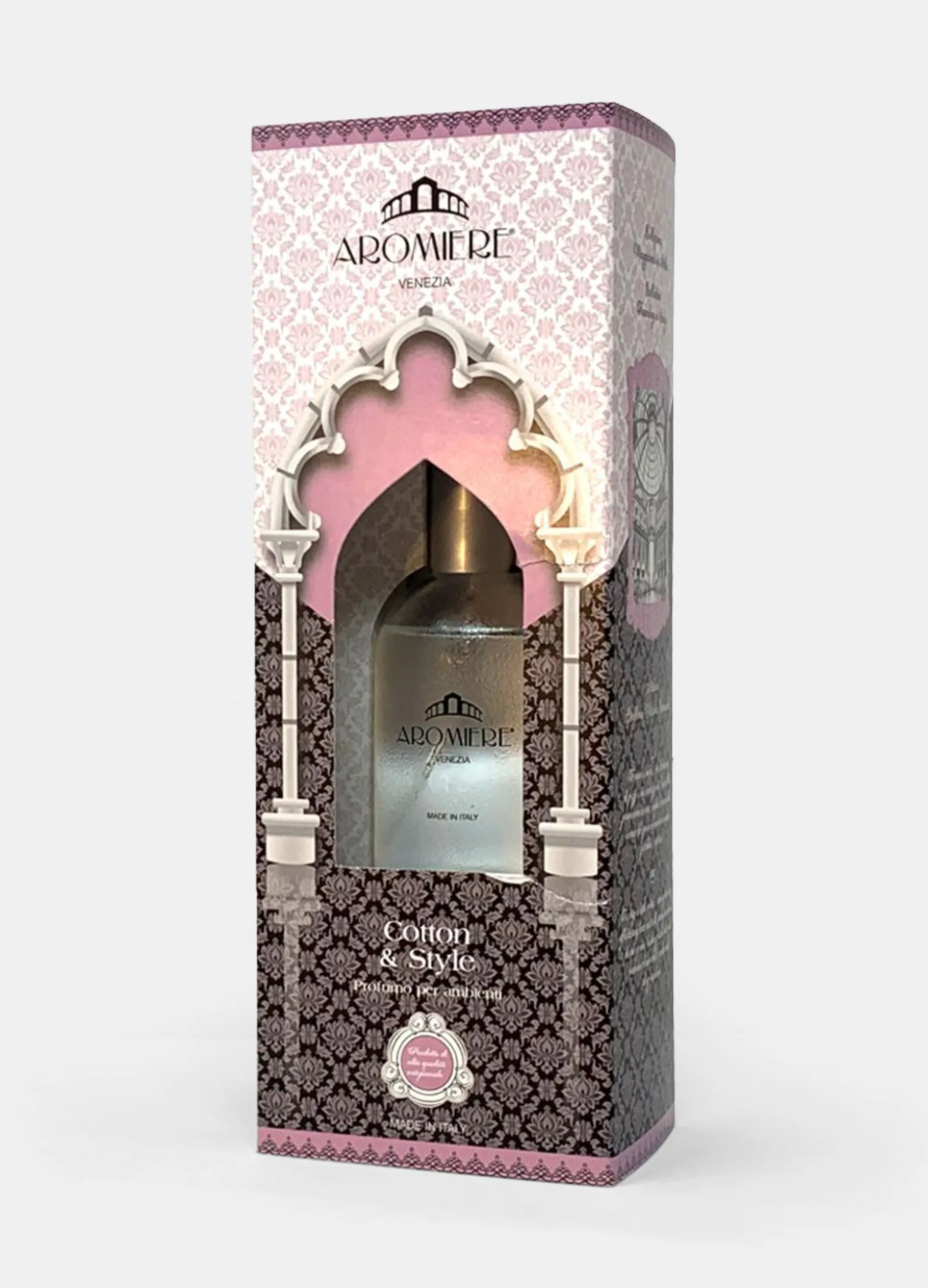Profumo per ambienti spray Aromiere Venezia aroma “Cotton & style”. Contenitore in vetro. Capacità 100ml. Altezza 25cm. Made in Italy.