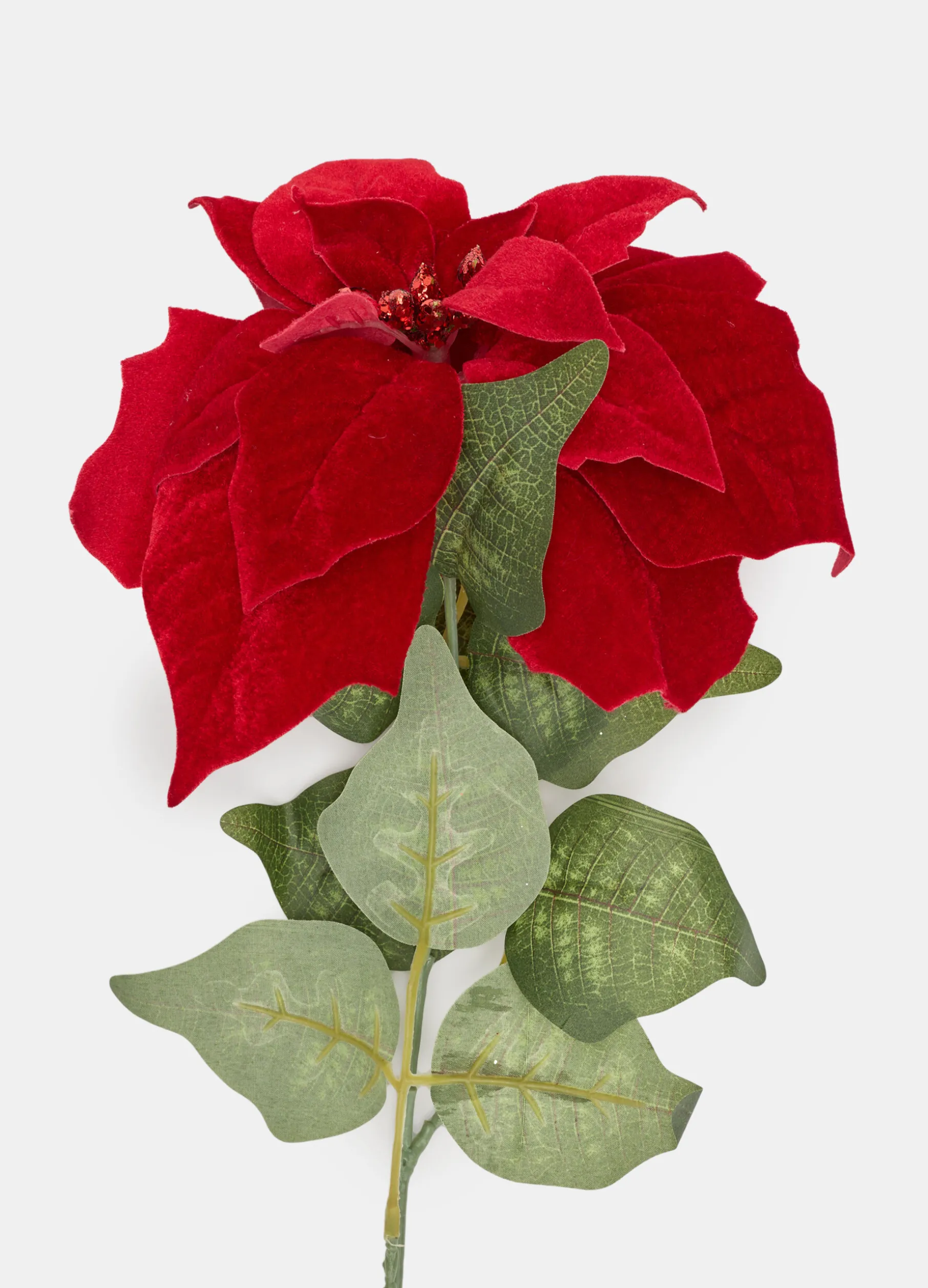 Fiore finto decorativo ispirato alla stella di Natale con lungo ramo verde, foglie ampie e una ricca corolla di petali rossi e vellutati, arricchiti da un tocco di glitter. Altezza: 75 cm; diametro: 25 cm.