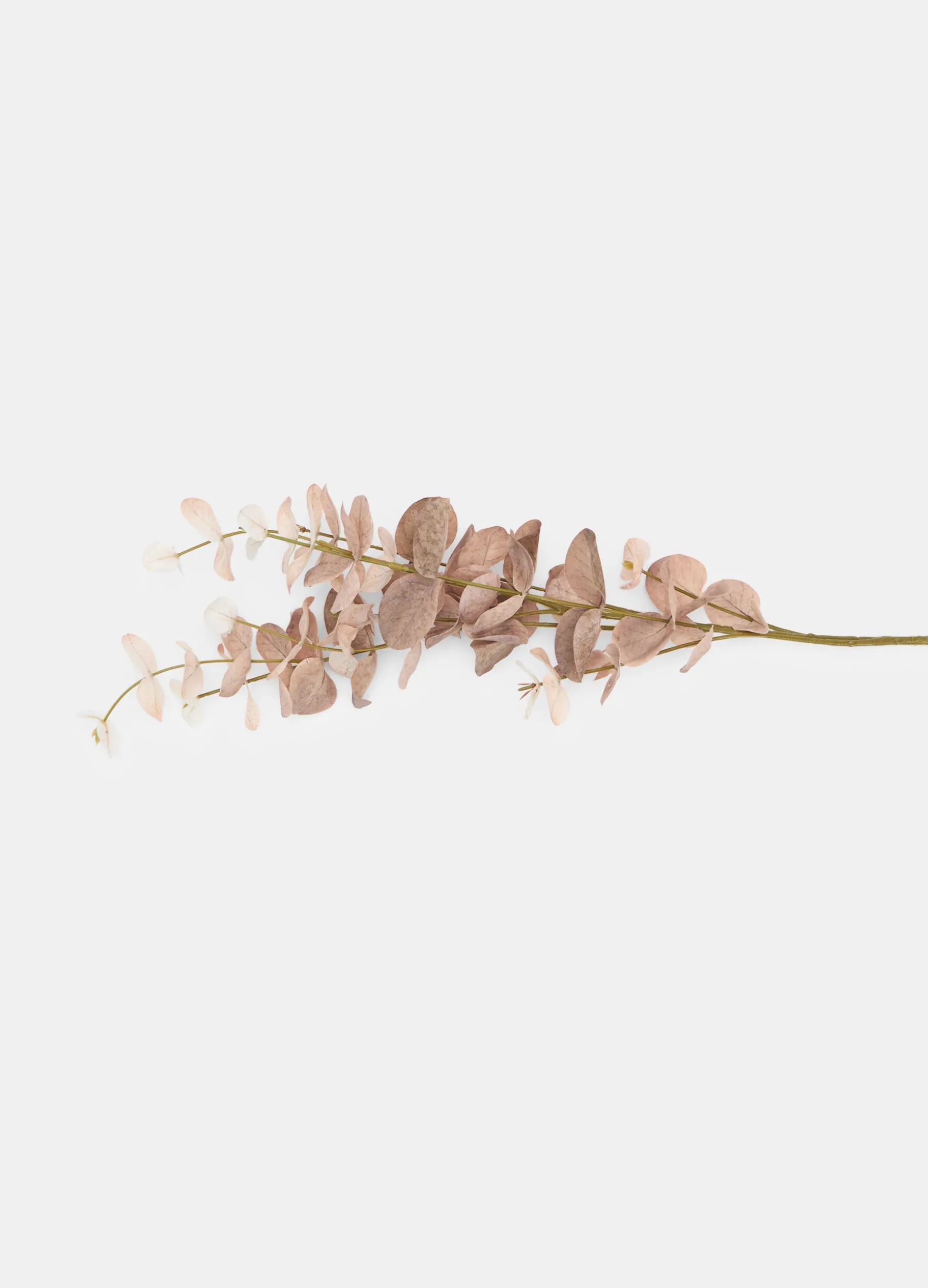 Ramo sottile e allungato di eucalipto secco, con le tipiche foglie rotonde di un marrone sbiadito che si abbina alle atmosfere invernali con un tocco ricercato. Altezza: 95 cm.