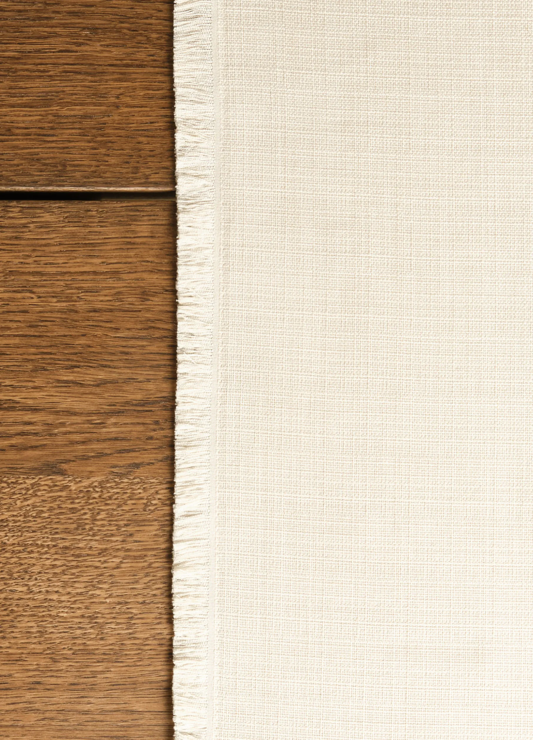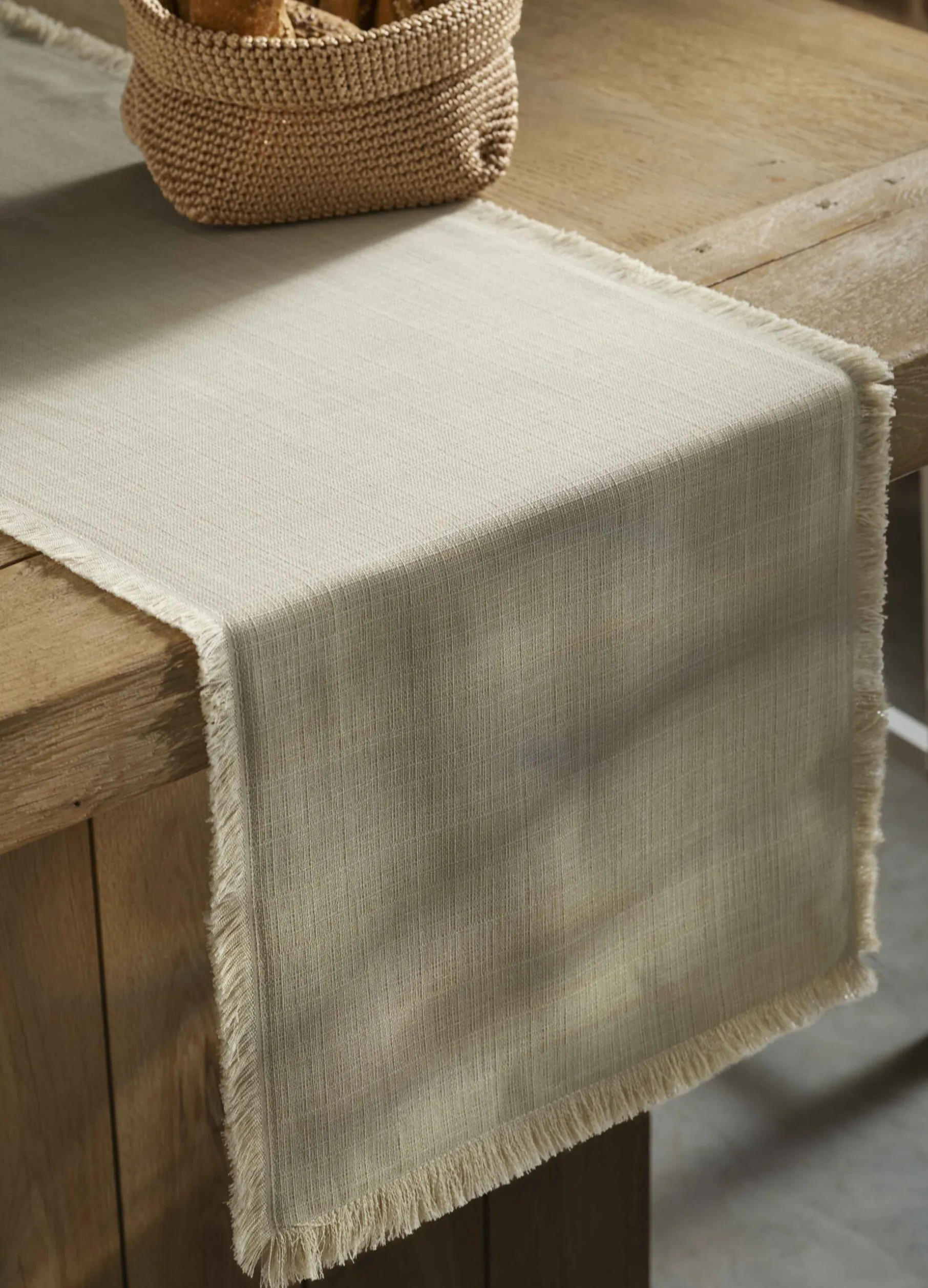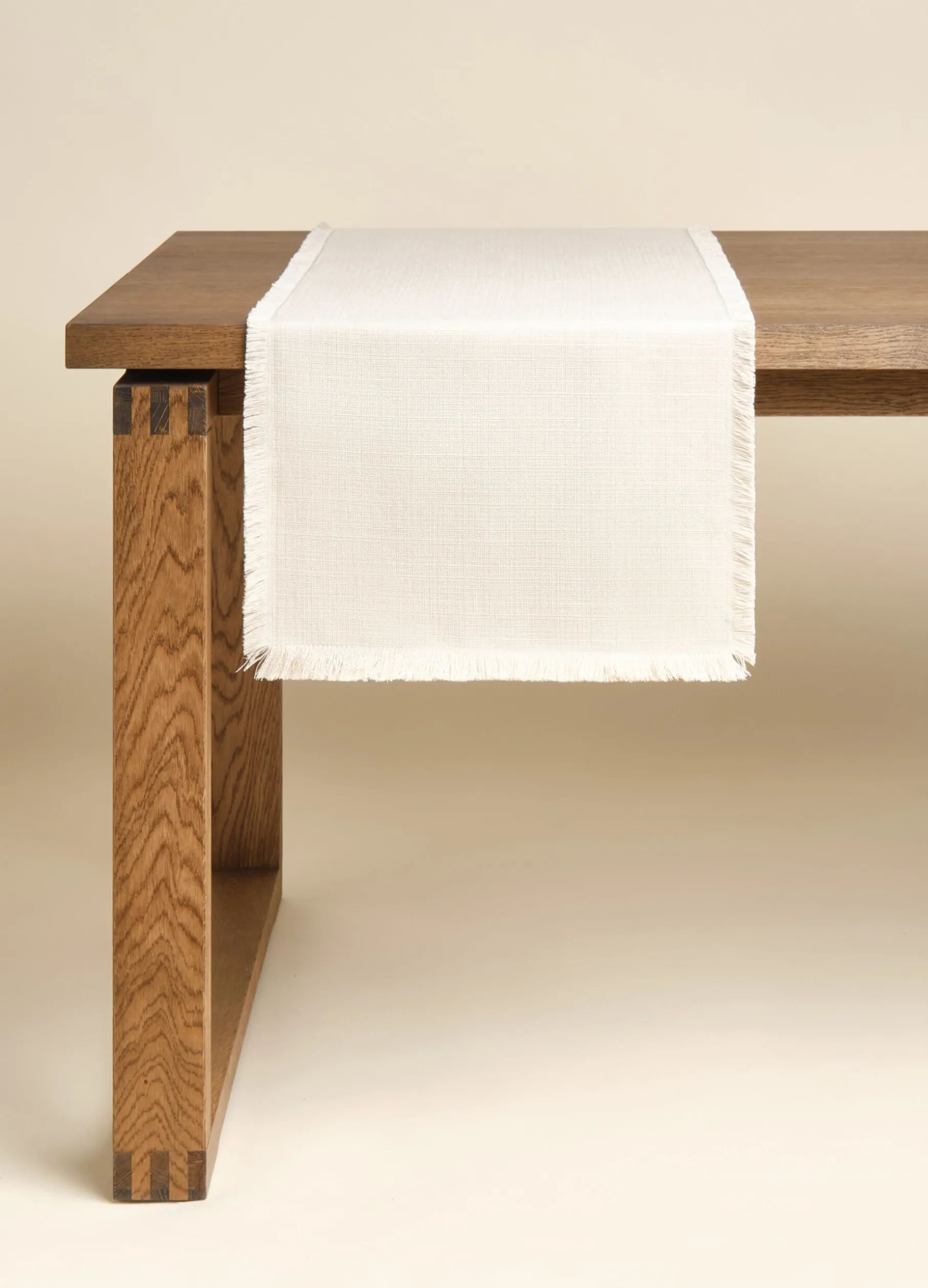Runner rettangolare bianco avorio dal look rustico-chic: realizzato in un particolare materiale antimacchia dalla texture grezza e irregolare, è completato da frange libere su tutti i lati. Dimensioni: 140 x 40 cm.
