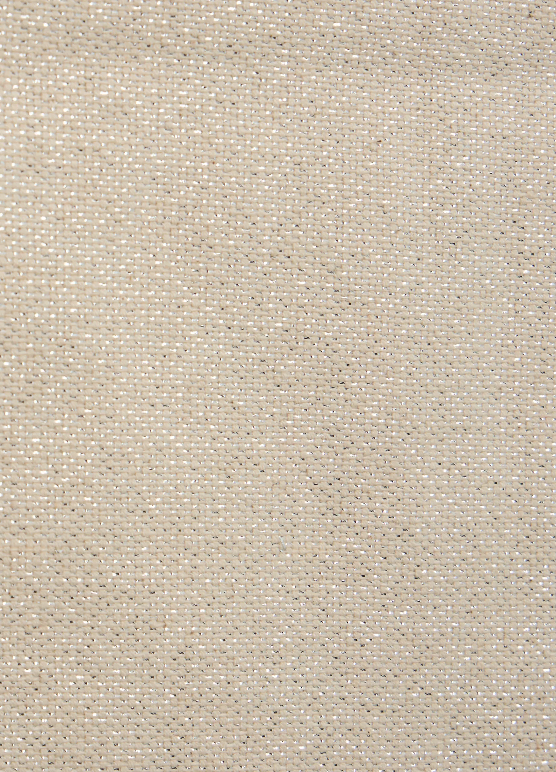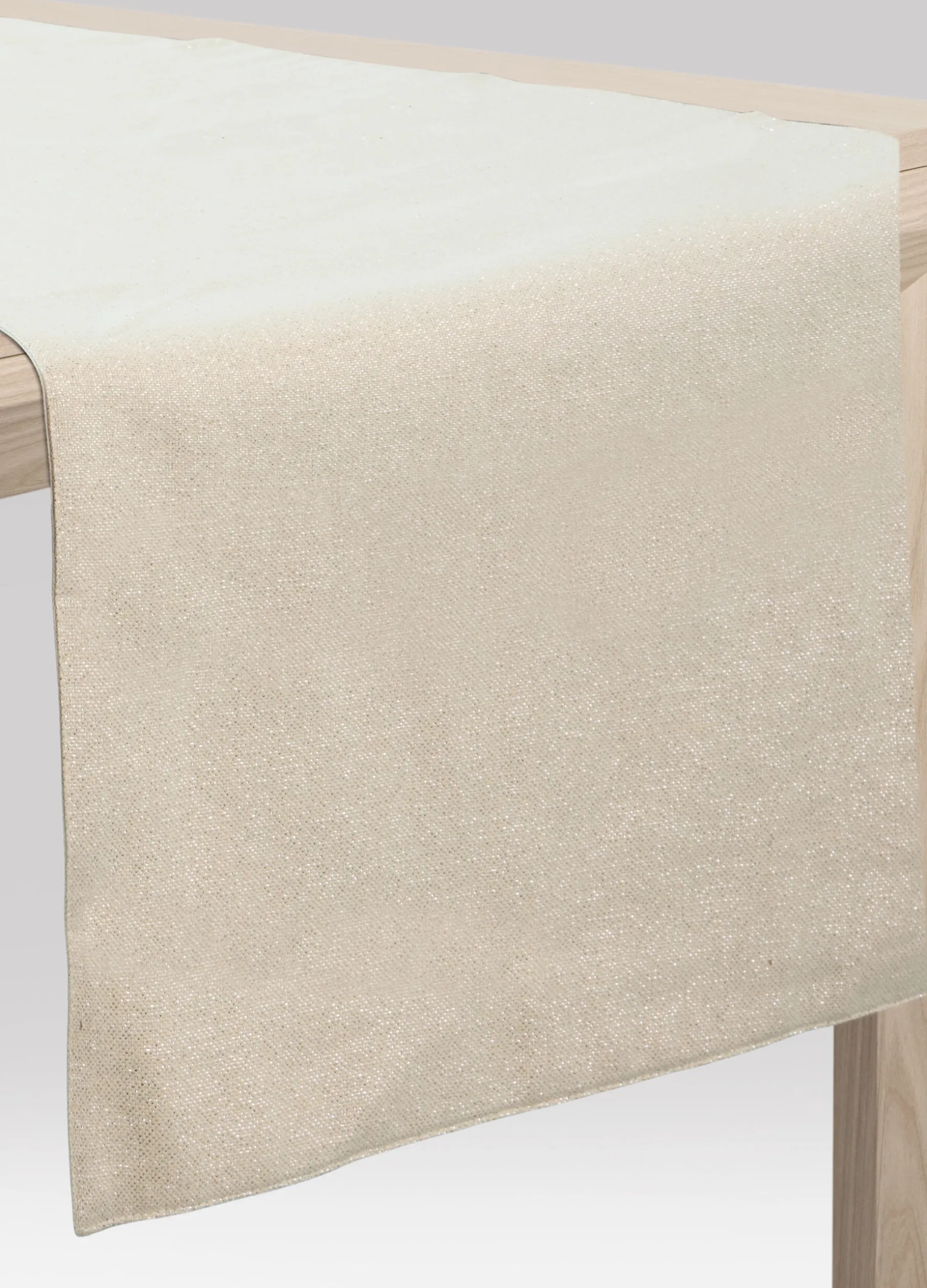 Runner dal gusto natalizio, coordinato al set da tavola, in misto cotone grigio chiarissimo, un tessuto delicato ed elegante arricchito dall’uso di fili metallici argentati lungo tutta la superficie, che accendono la tavola di allegria e magia. Dimensioni: 140 x 40 cm.