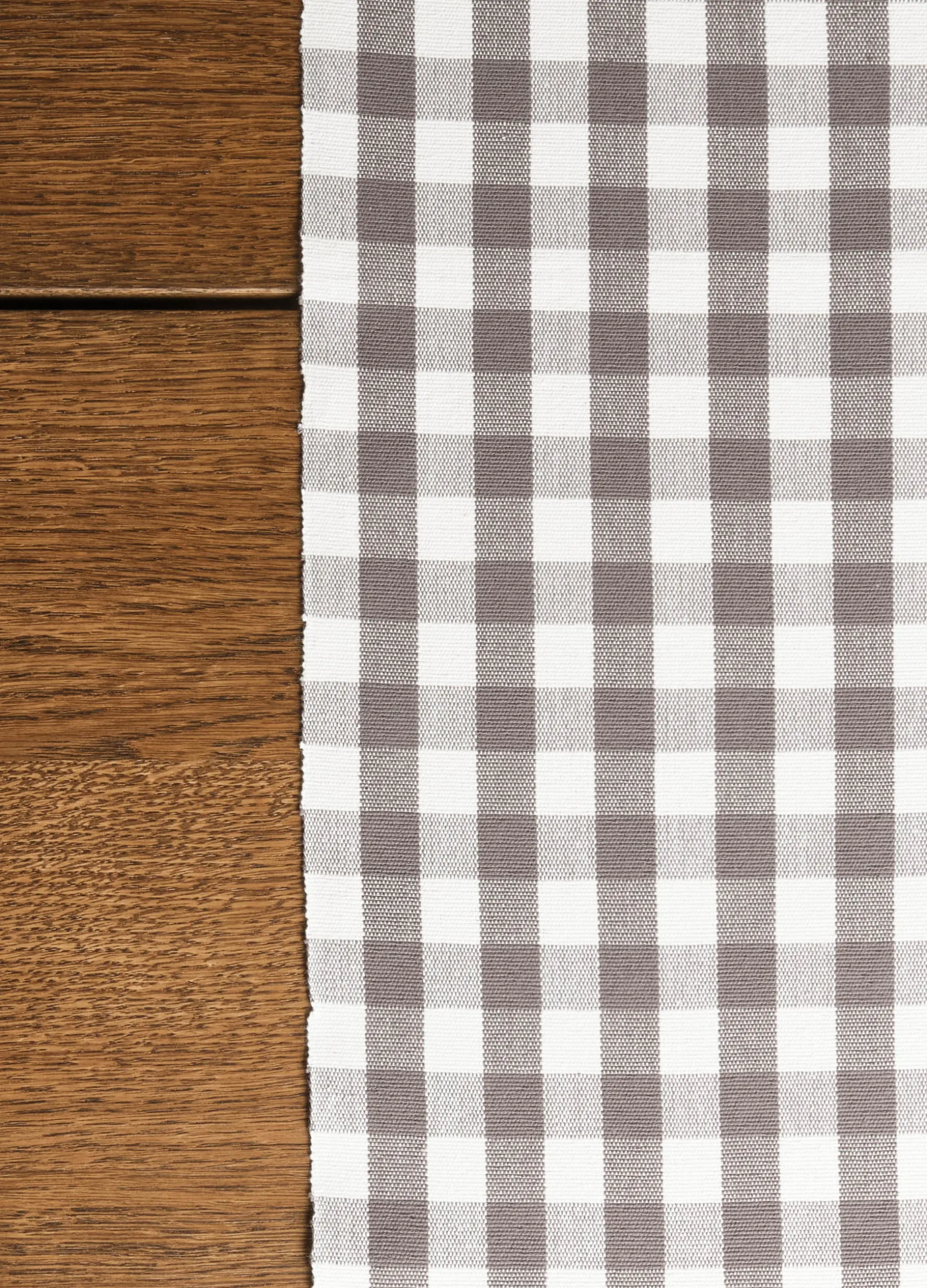 Runner in puro filato di cotone, resistente e versatile, dal look rustico grazie alla fantasia a quadretti in grigio scuro e bianco.