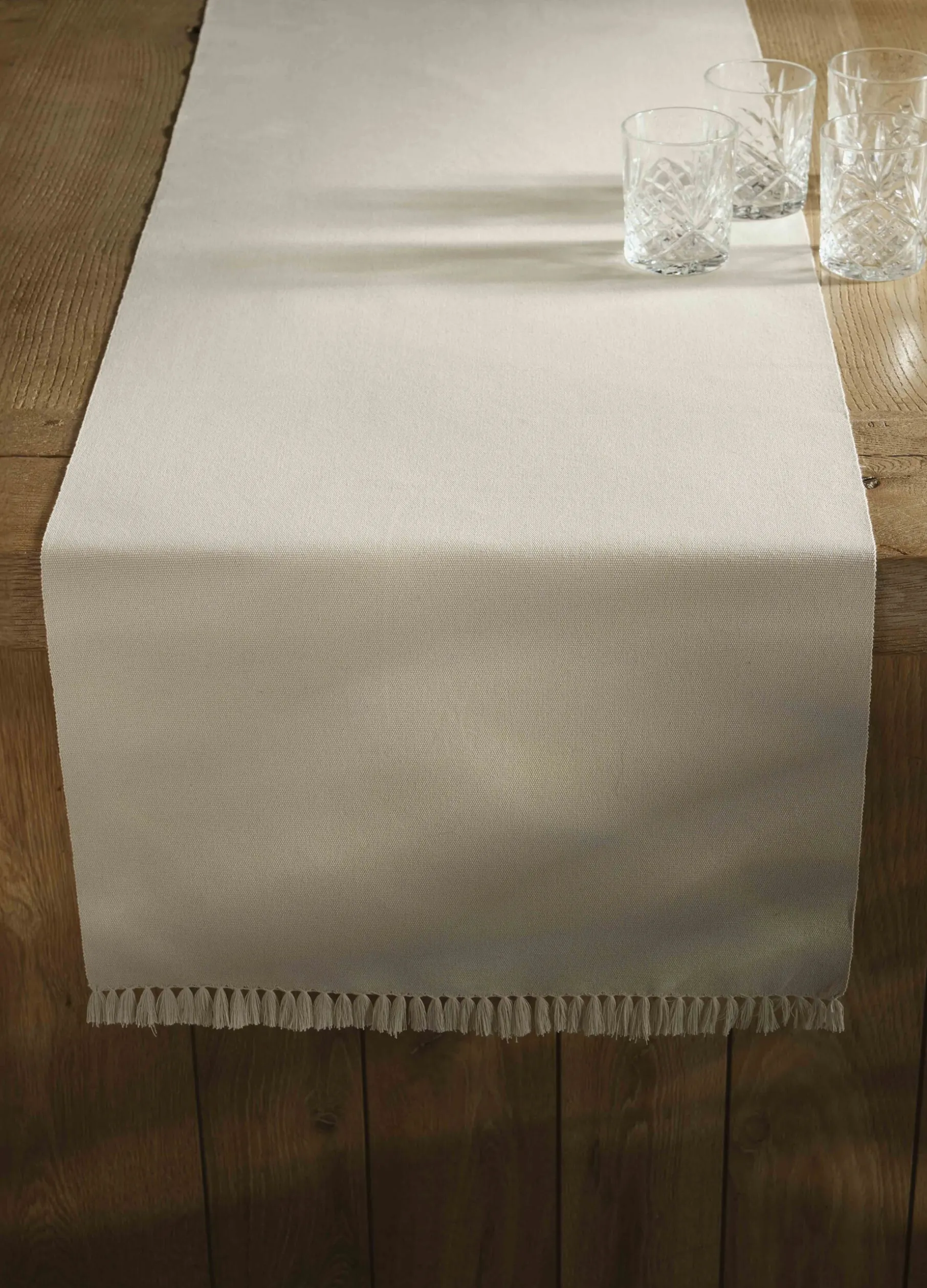 Runner rettangolare, ideale per il tavolo della cucina o della sala, realizzato in puro cotone biologico dalla trama grezza e resistente in una fresca tonalità di bianco. Con frange annodate sui lati corti. Dimensioni: 140 x 45 cm.
