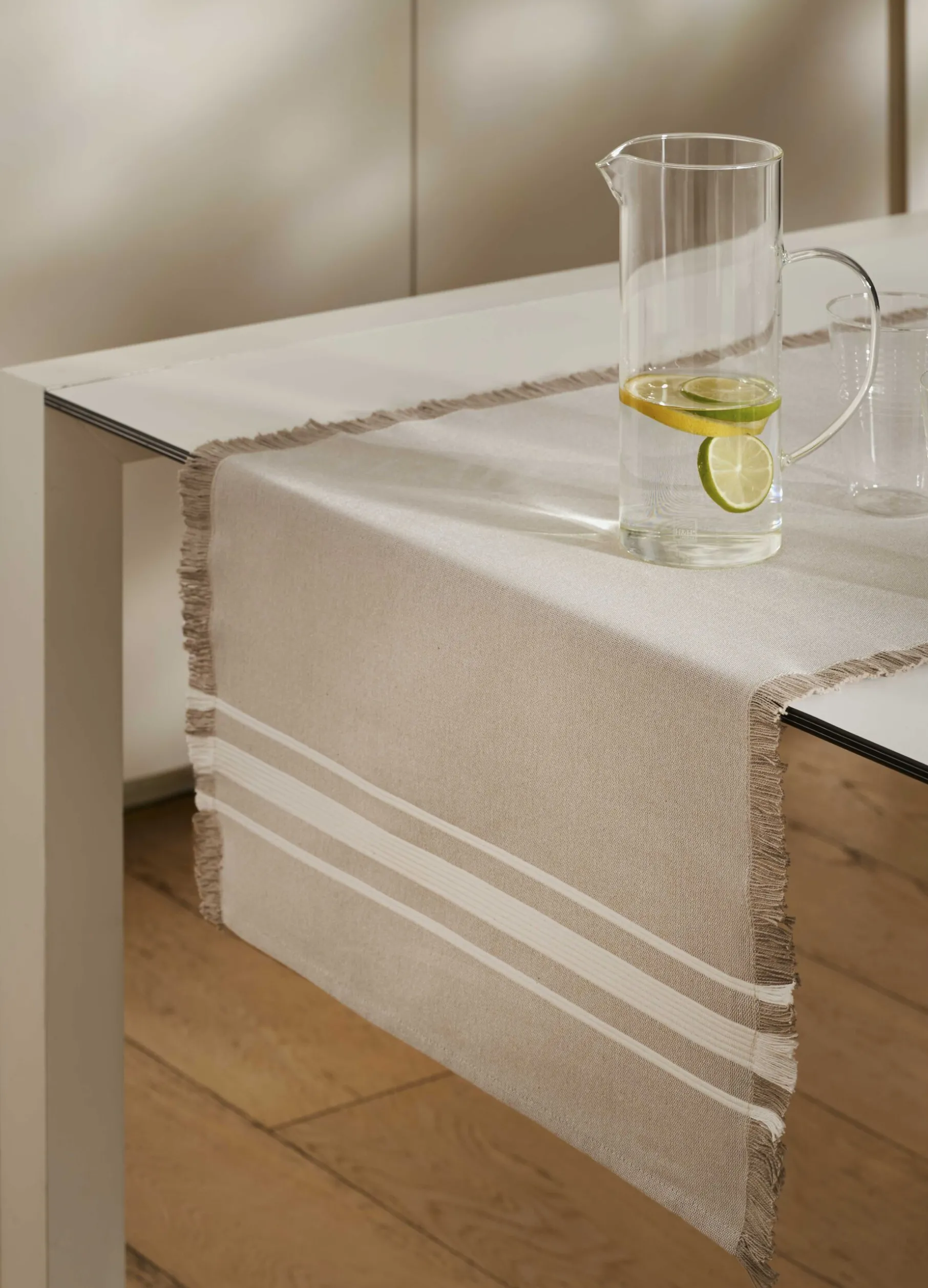 Runner dal look rustico e accogliente, ideale per la sala o la cucina, in cotone marrone écru dalla particolare texture mélange, con inserti a contrasto più spessi e frange aperte sui lati lunghi.