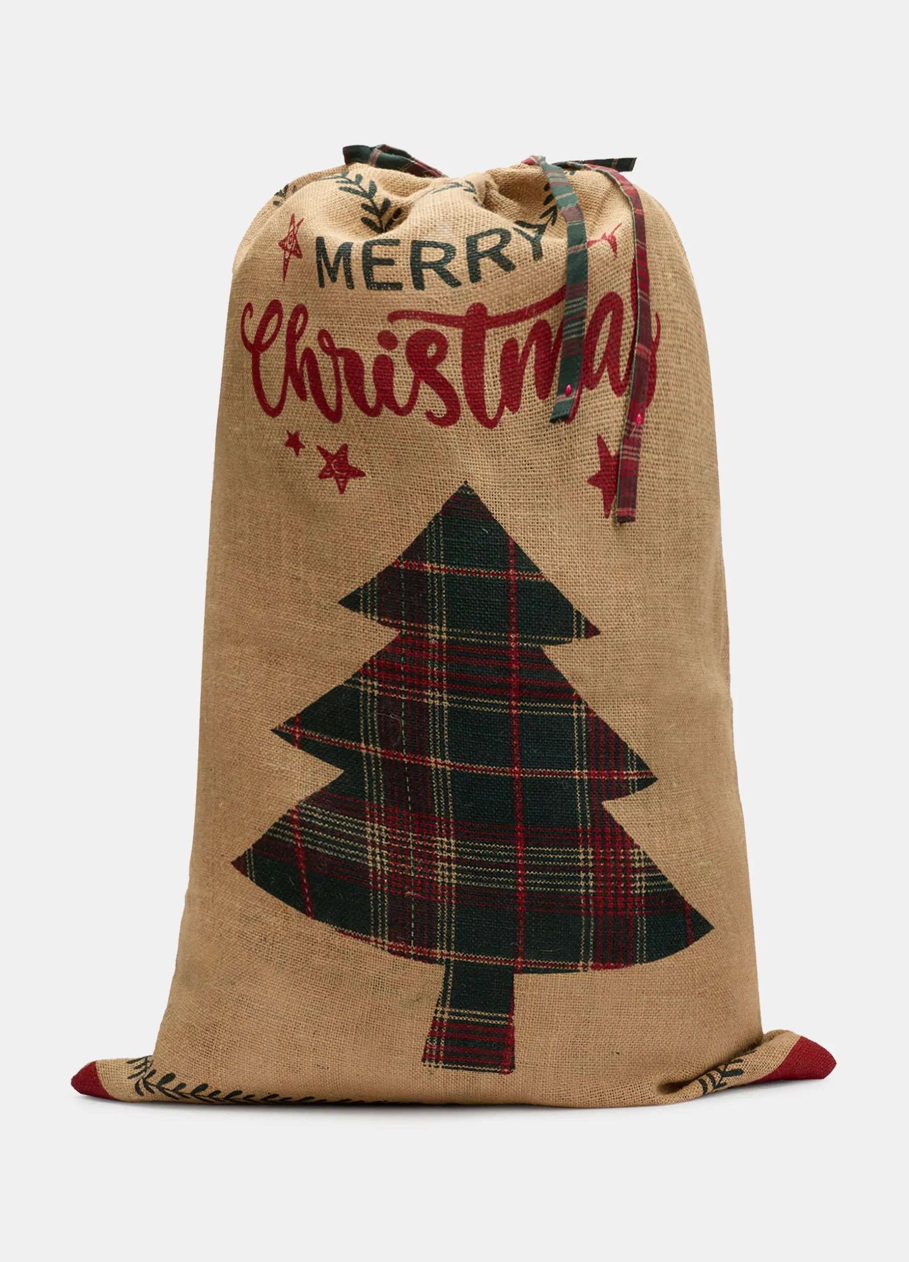 Sacco in iuta leggero dalla caratteristica grana naturale e grezza, un dettaglio unico per rallegrare l’atmosfera natalizia e riporre tutti i regali più speciali. Con stampa Merry Christmas e nastrino in cotone tartan. Dimensioni: 80 x 55 cm.