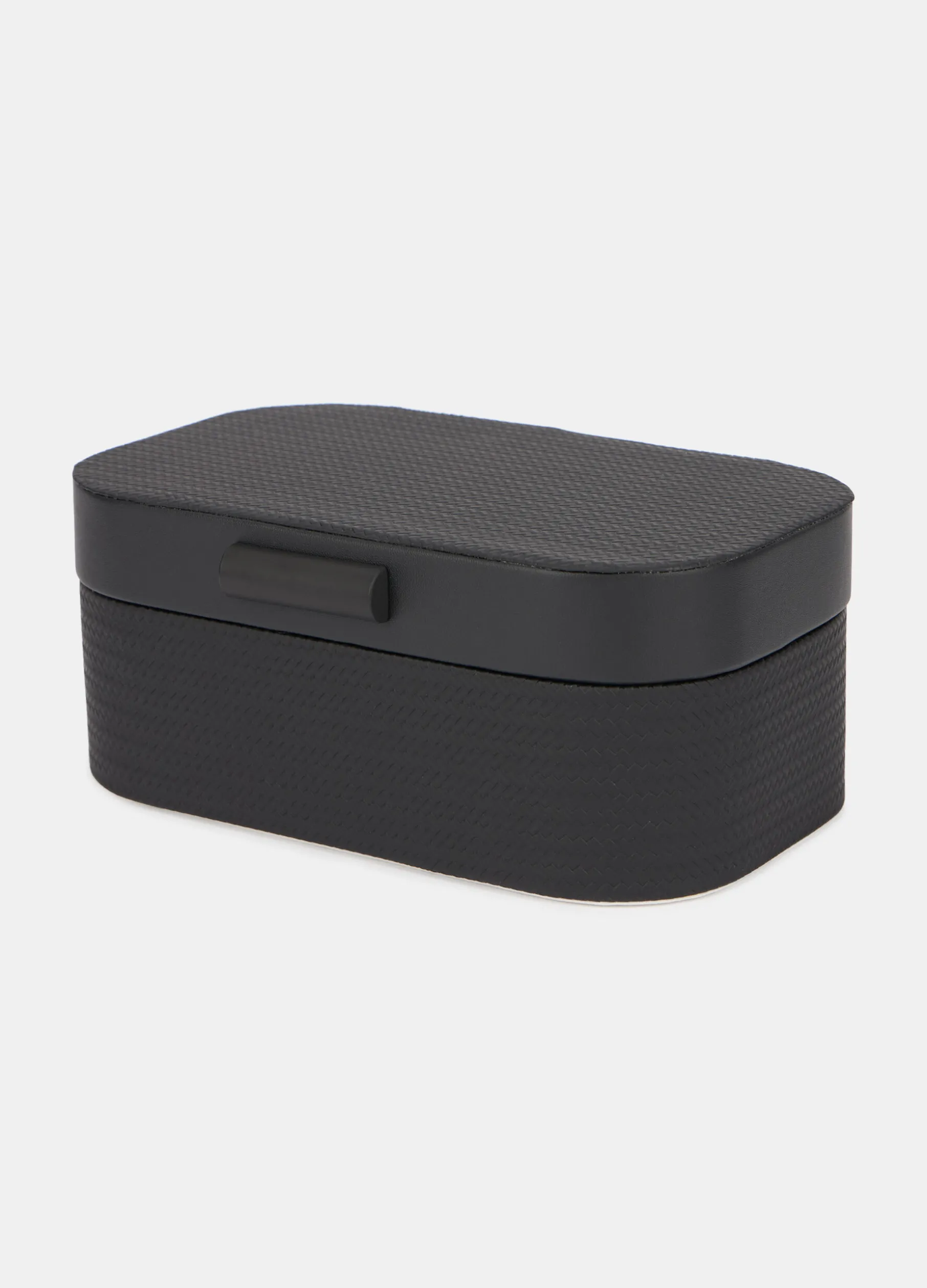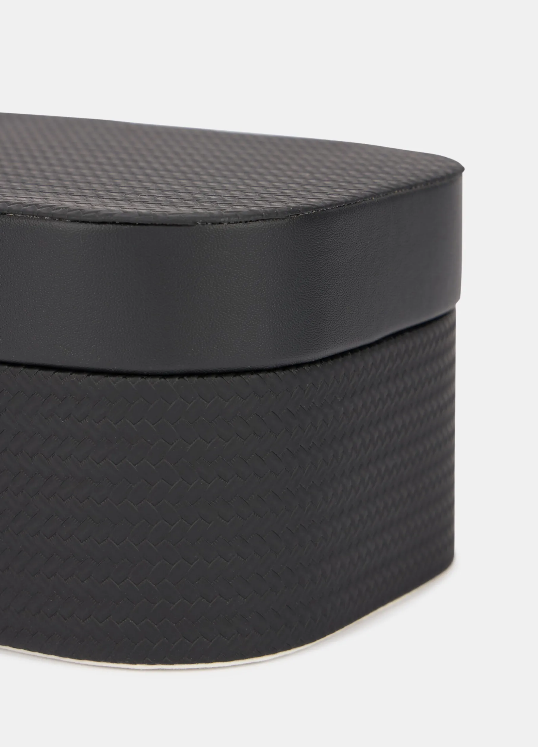 Scatola ovale portaoggetti in materiale nero effetto pelle: le parti intrecciate hanno una texture unica e interessante, in contrasto con le fasce lisce sul coperchio e sul fondo. Dimensioni: 12 x 20 x 8 cm.