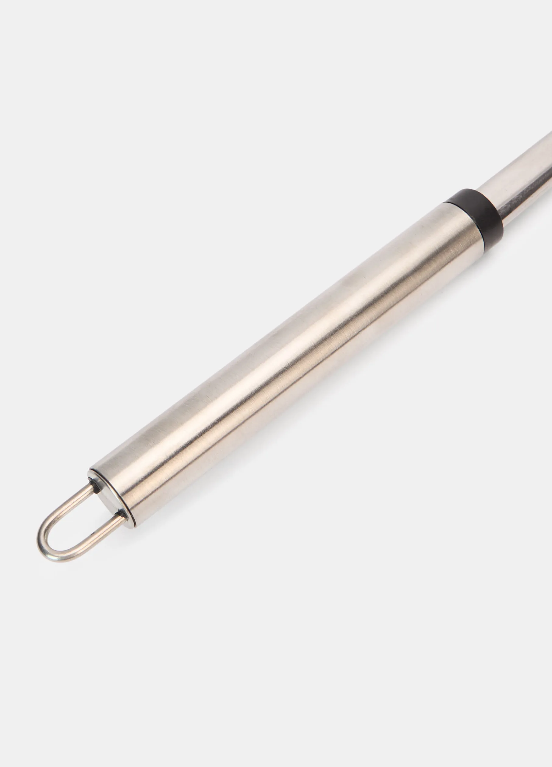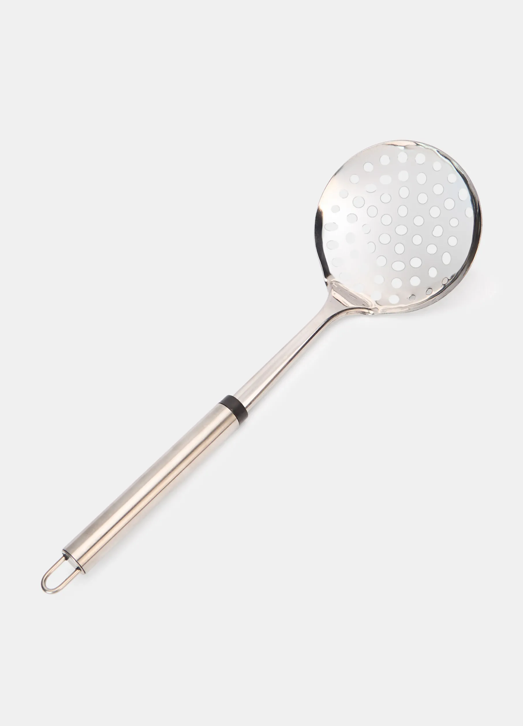 Schiumarola da cucina in puro acciaio dalla superficie lucida e liscia, con manico rinforzato e gancetto per appenderlo comodamente alle pareti o sopra i fornelli.
