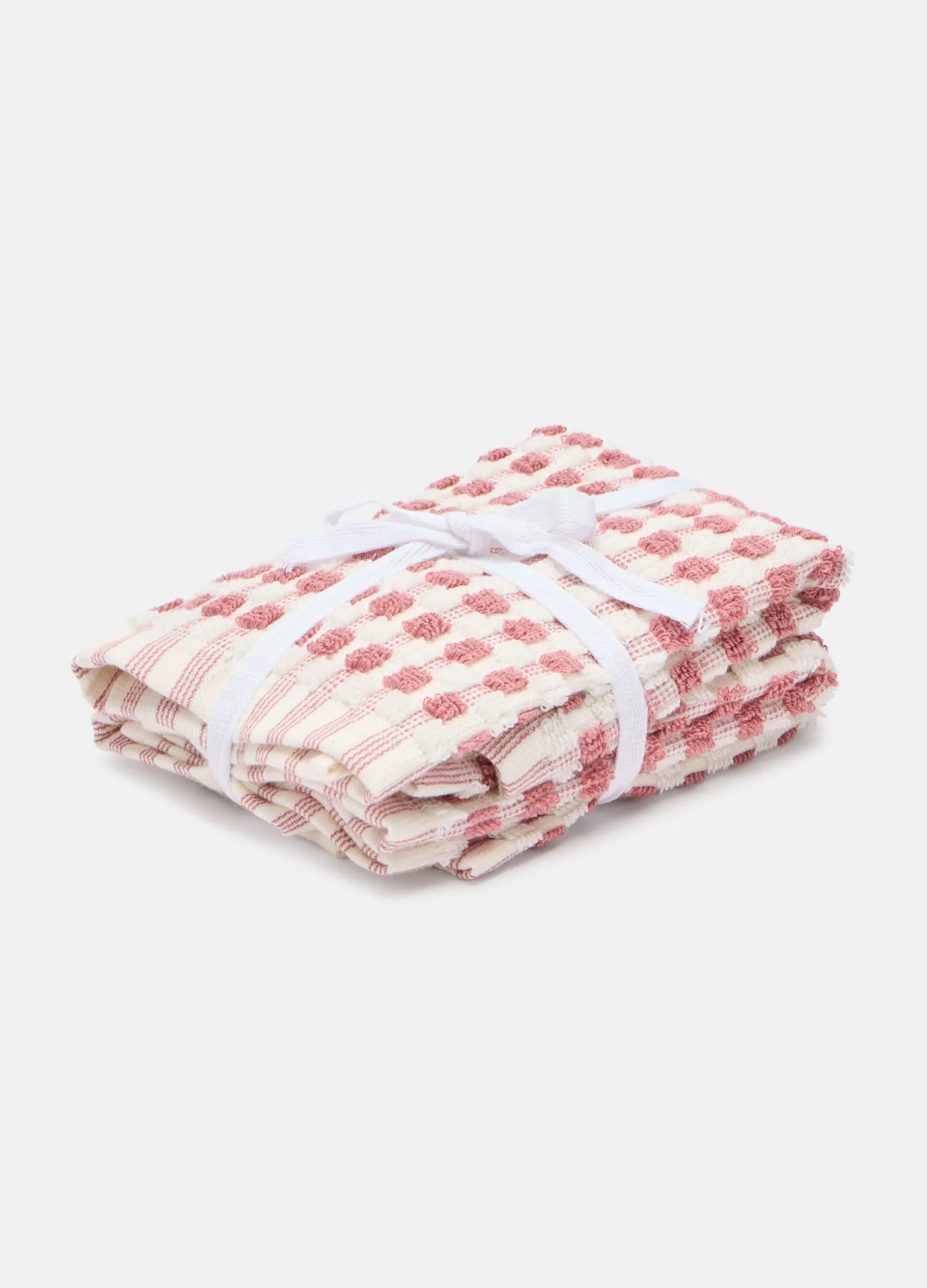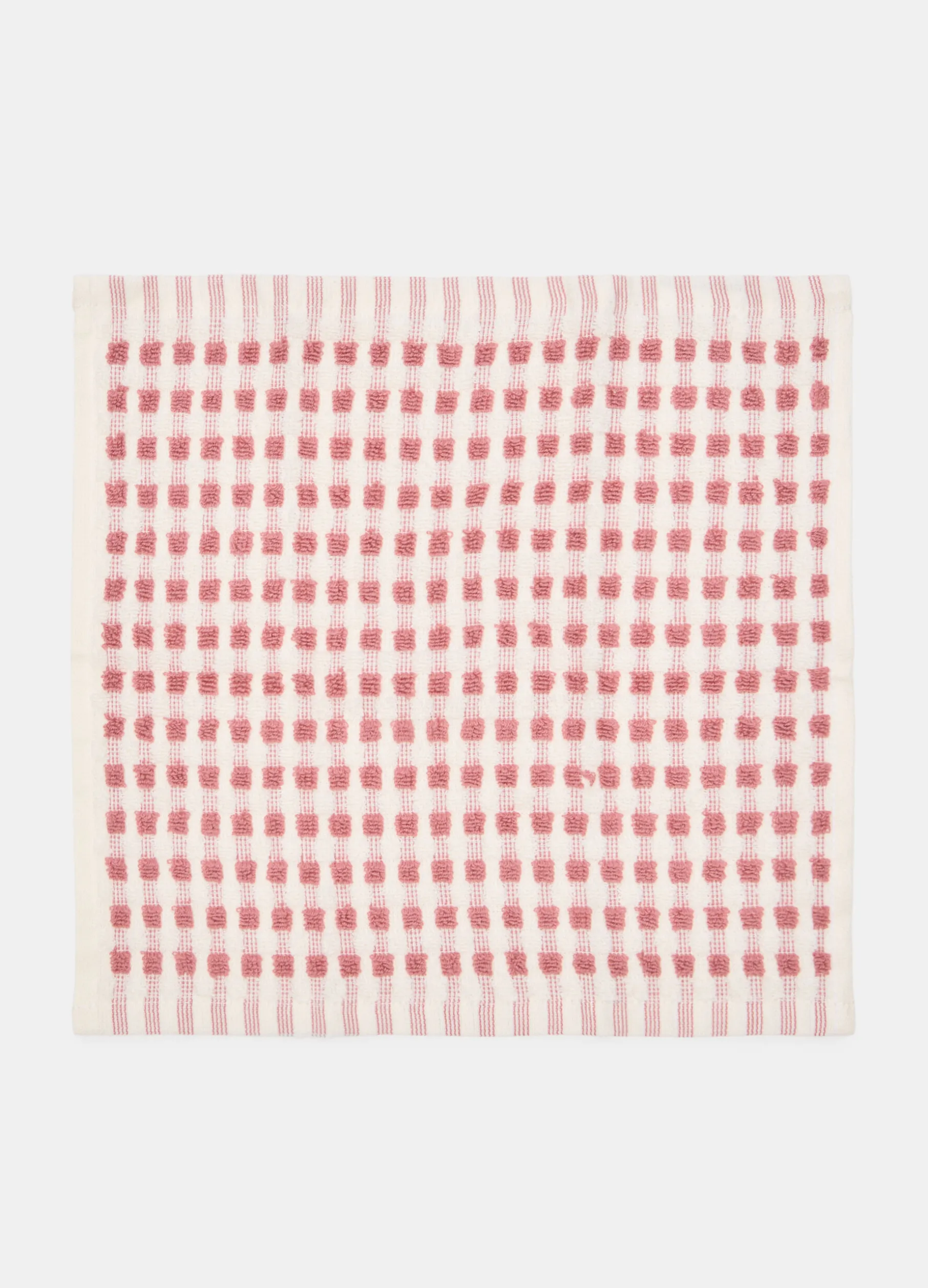 Set composto da quattro asciugamani quadrati, ideali per il viso o come salviette per gli ospiti, realizzati in spugna di puro cotone a nido d’ape, che assorbe efficacemente l’acqua e resta delicata sulla pelle. La trama caratteristica è arricchita da un motivo a quadretti rosa. Dimensioni: 30 x 30 cm.