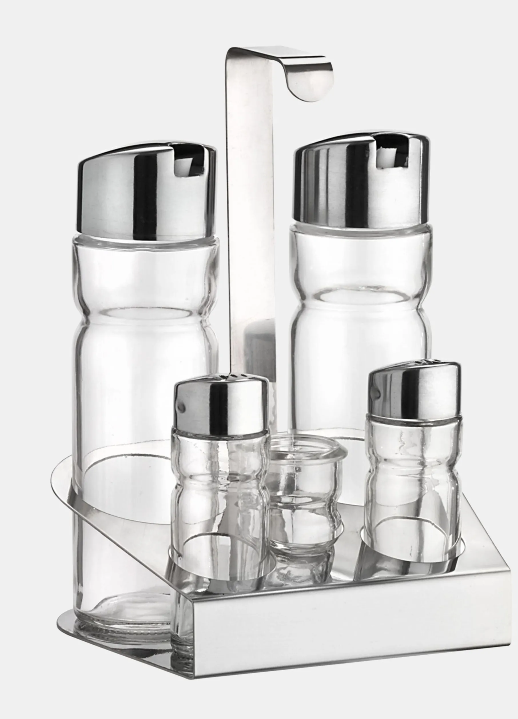 Set 5 pezzi oliera in vetro e acciaio inox. Dimensioni 11x20x24cm.