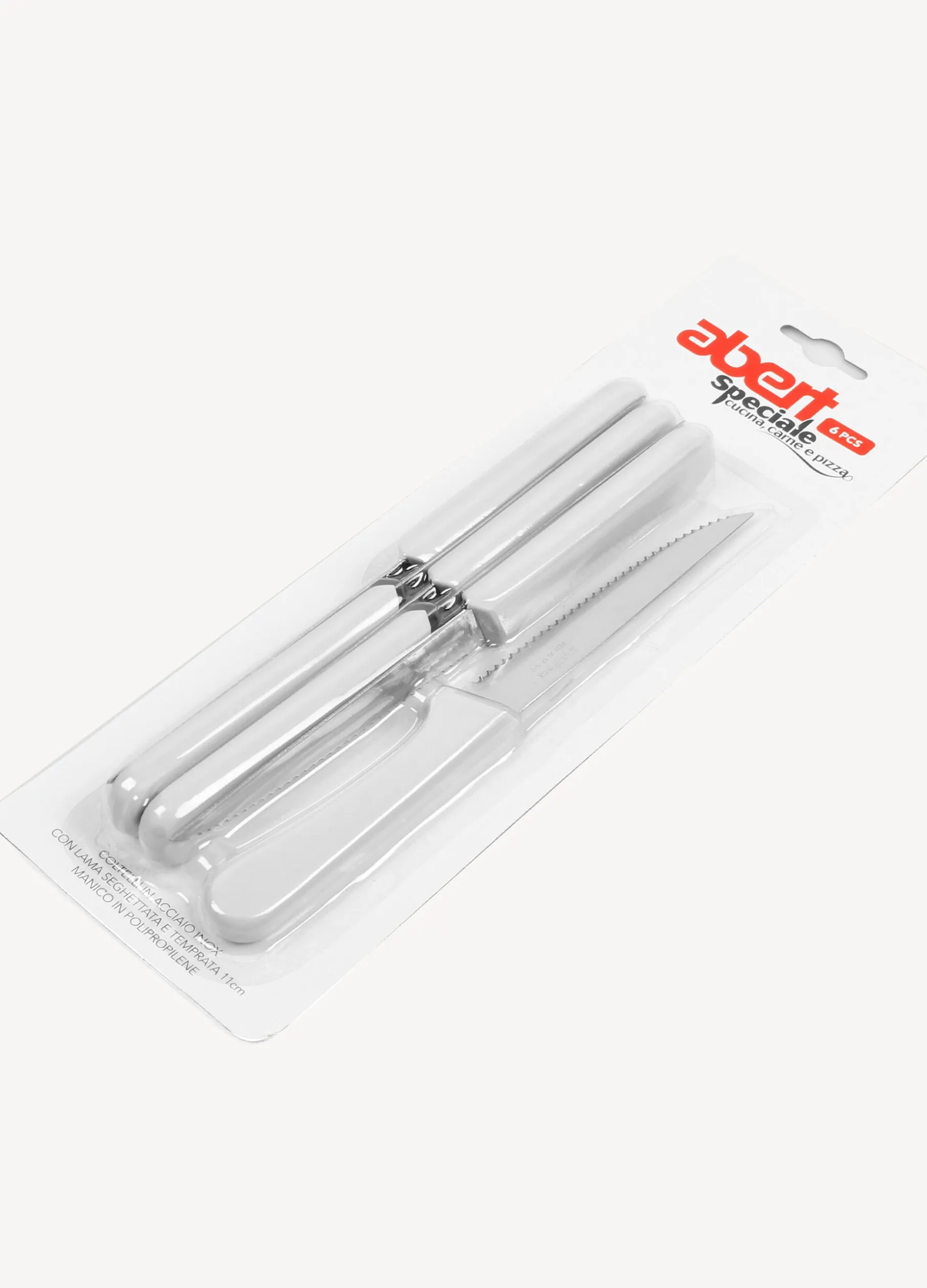 Set 6 coltelli in acciaio con manico bianco. Dimensioni confezione 21×2,2×10 cm.
