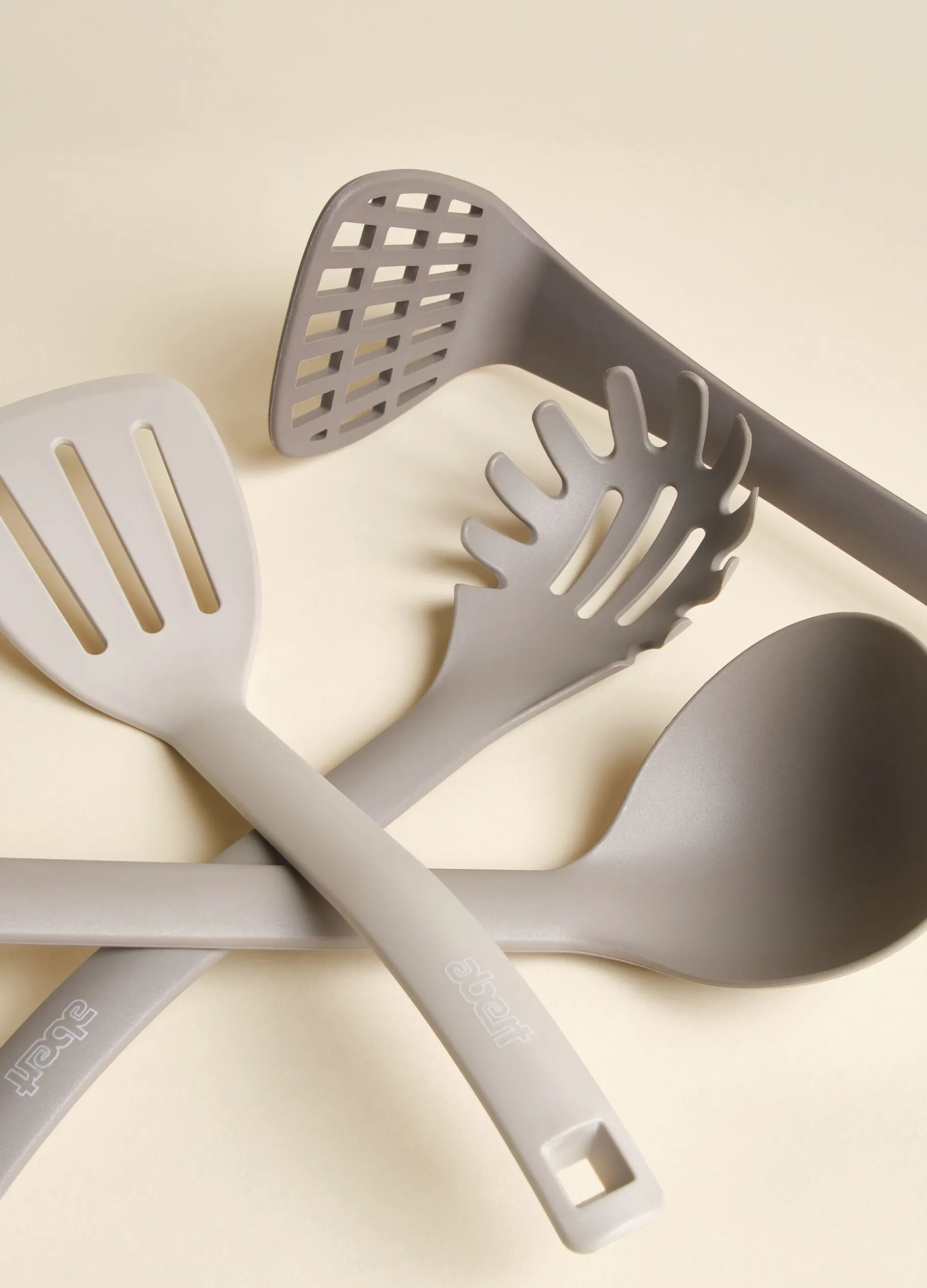 Set utensili da cucina. Set composto da uno schiacciapatate, un mestolo, un servispaghetti, un cucchiaione e una pala multiuso. Tinta unita.