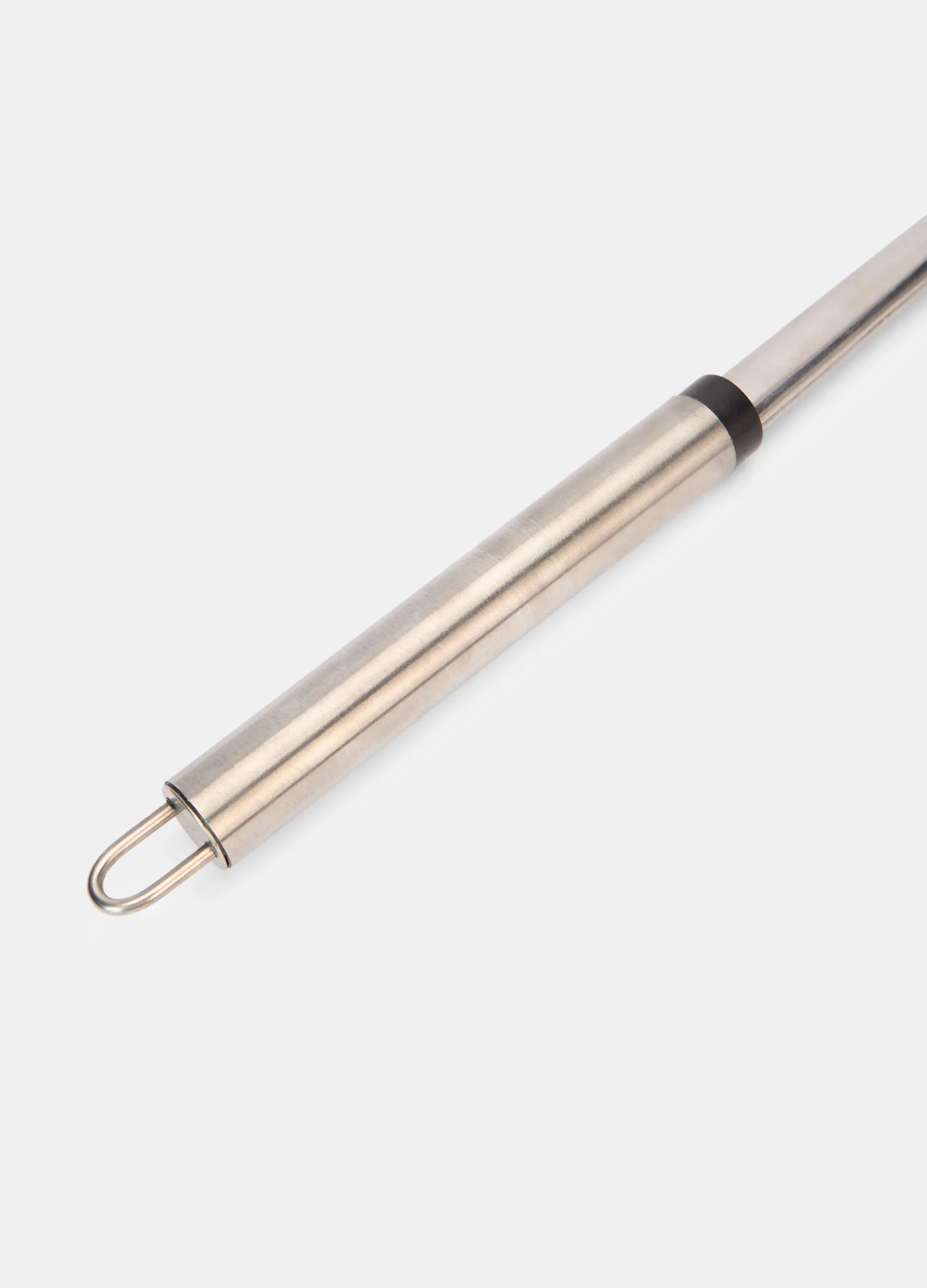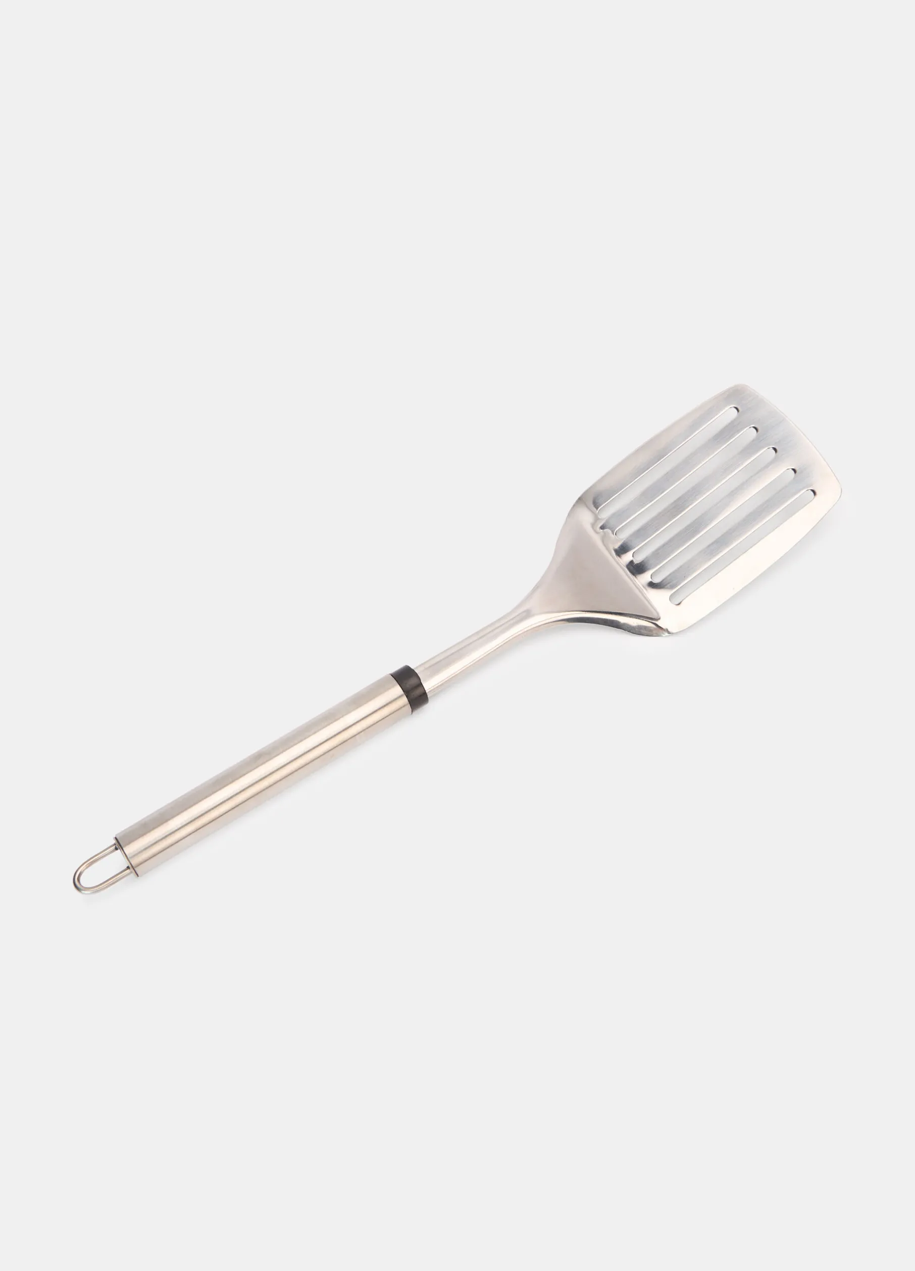 Spatola da cucina in puro acciaio dalla superficie lucida e liscia, con manico rinforzato e gancetto per appenderlo comodamente alle pareti o sopra i fornelli.