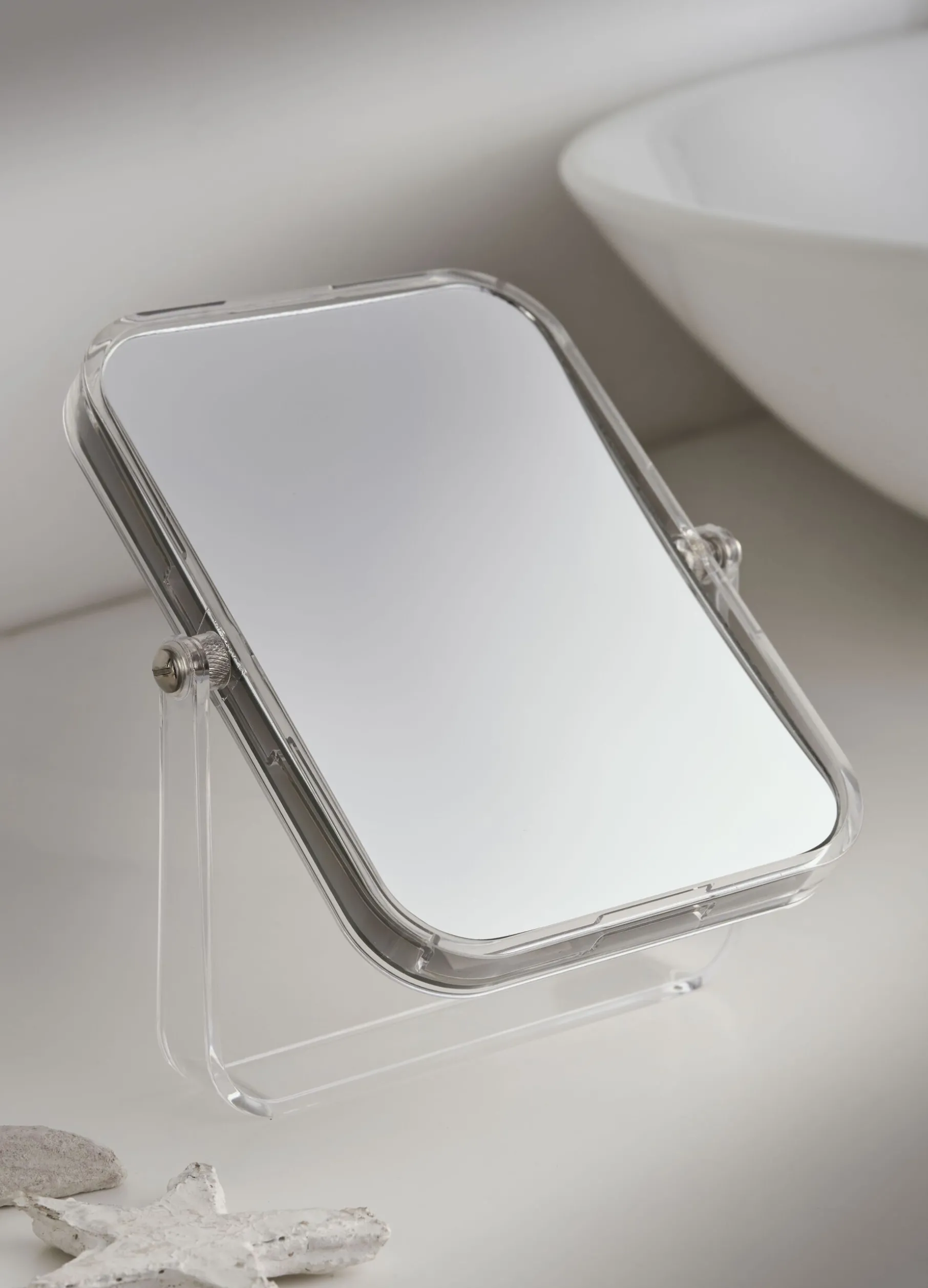 Specchio da tavolo rettangolare con bordi smussati in plastica trasparente. Dimensioni 19,5×16,5×2,5cm.