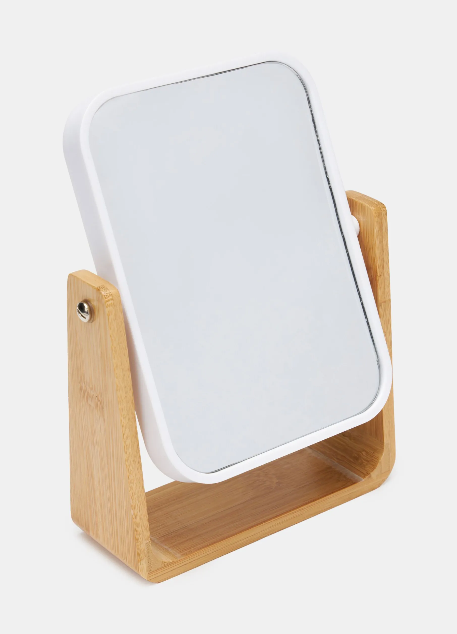 Specchio rettangolare con base in bamboo. Dimensioni 22×17,5×5,8cm.