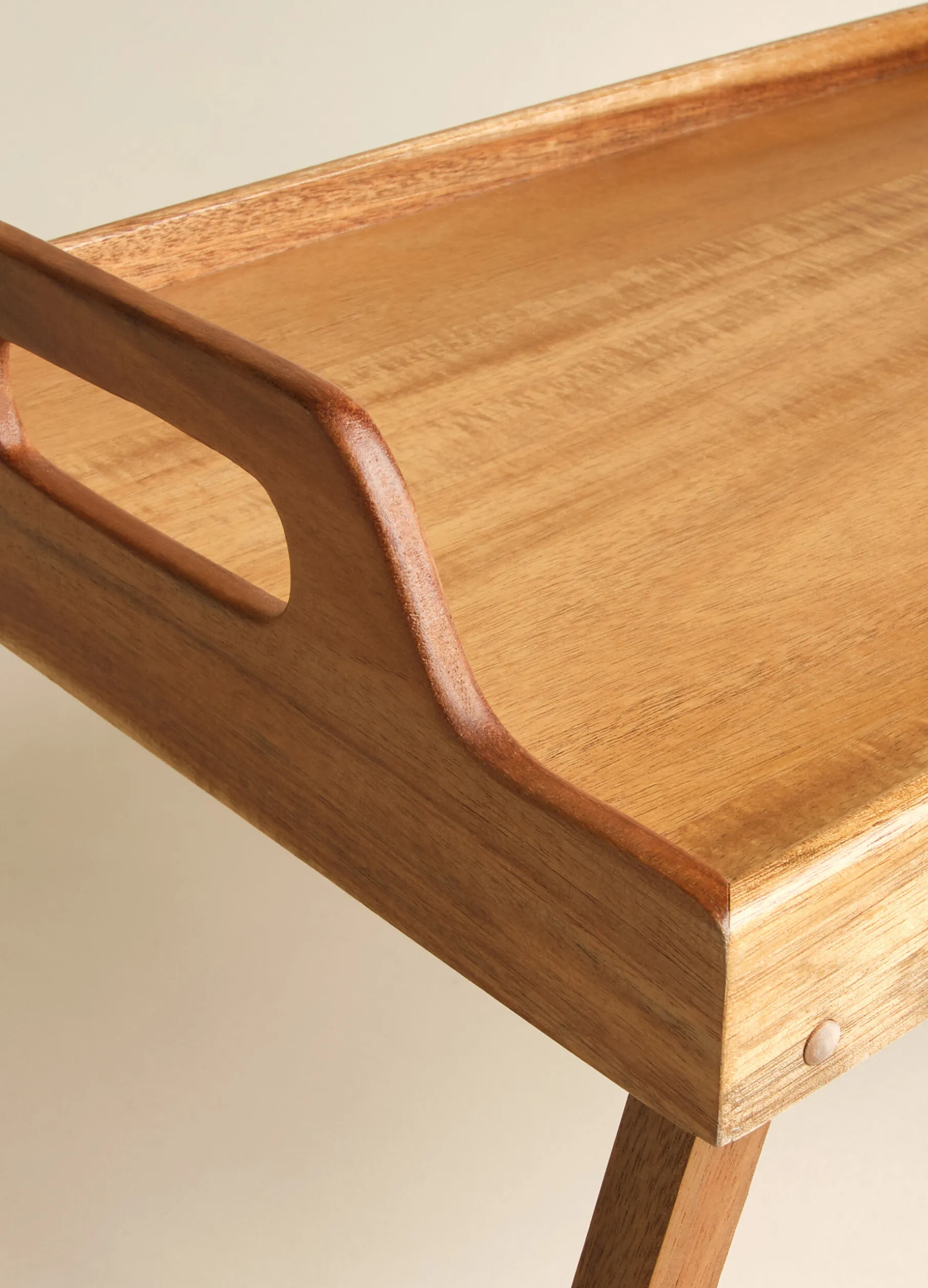 Tavolino da colazione in legno rettangolare con manici.