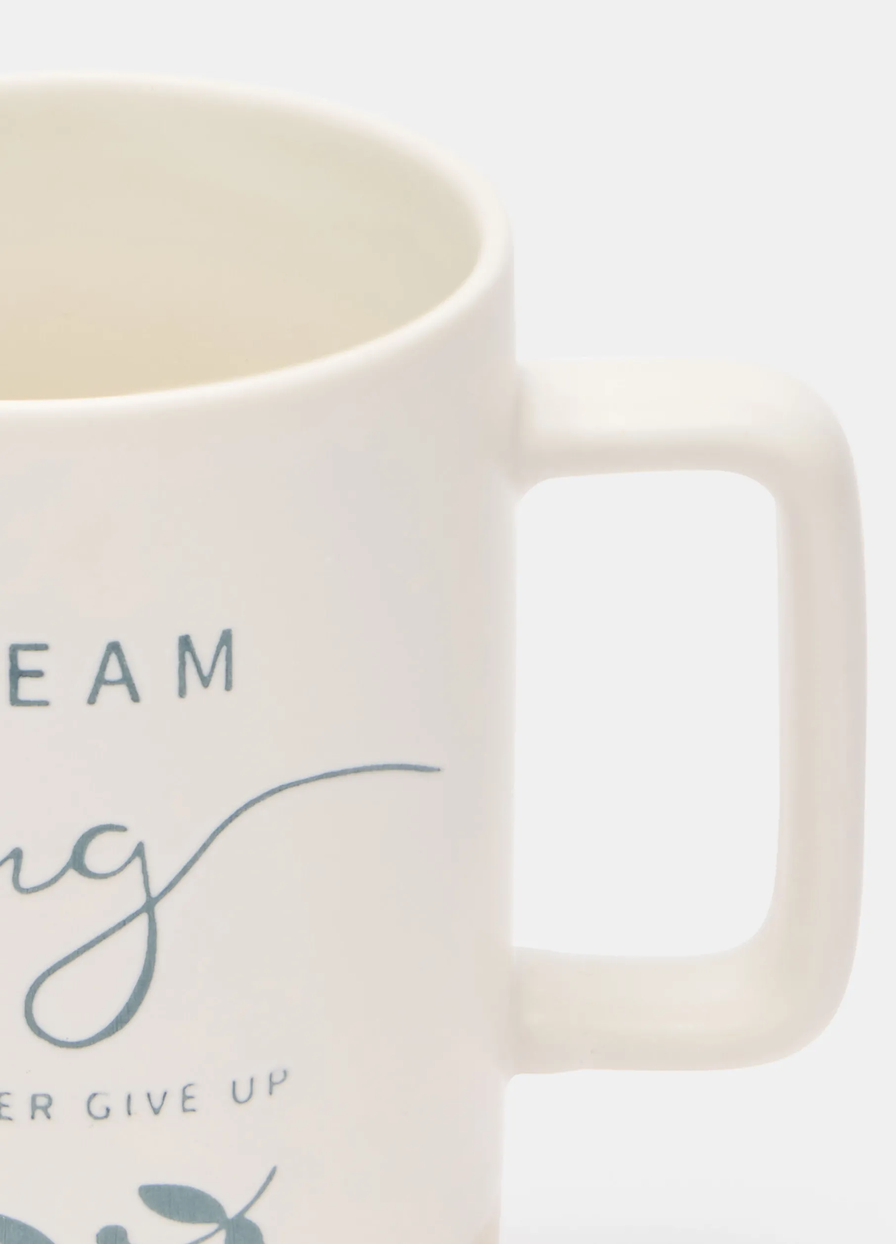 Tazza in ceramica color crema alta e capiente, ideale per accogliere l’autunno con deliziose bevande calde come tè e cioccolata. Arricchita da una decorazione botanica e dalla scritta “Dream big and never give up”, è completata dal pratico manico squadrato. Altezza: 10 cm; capacità: 400 mL.
