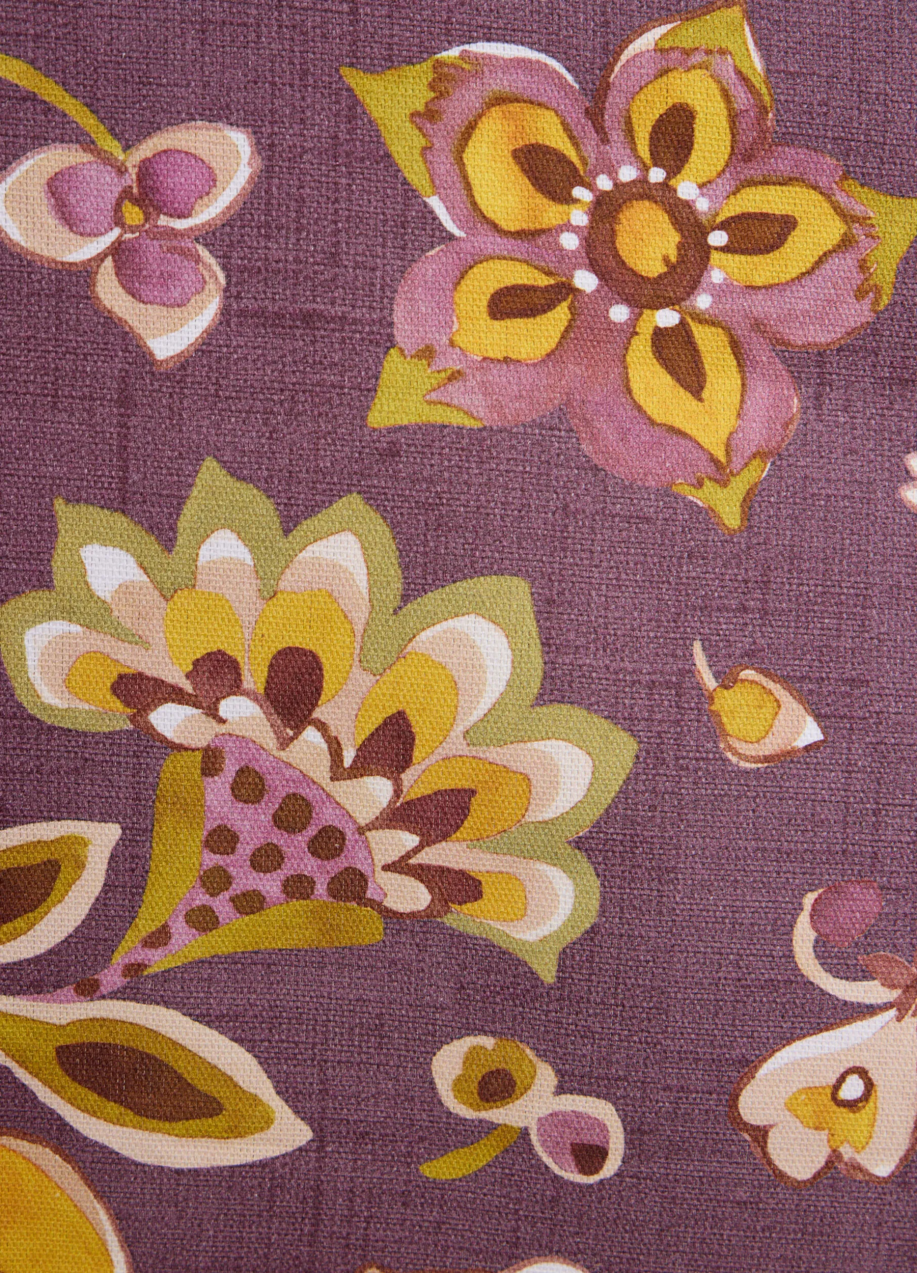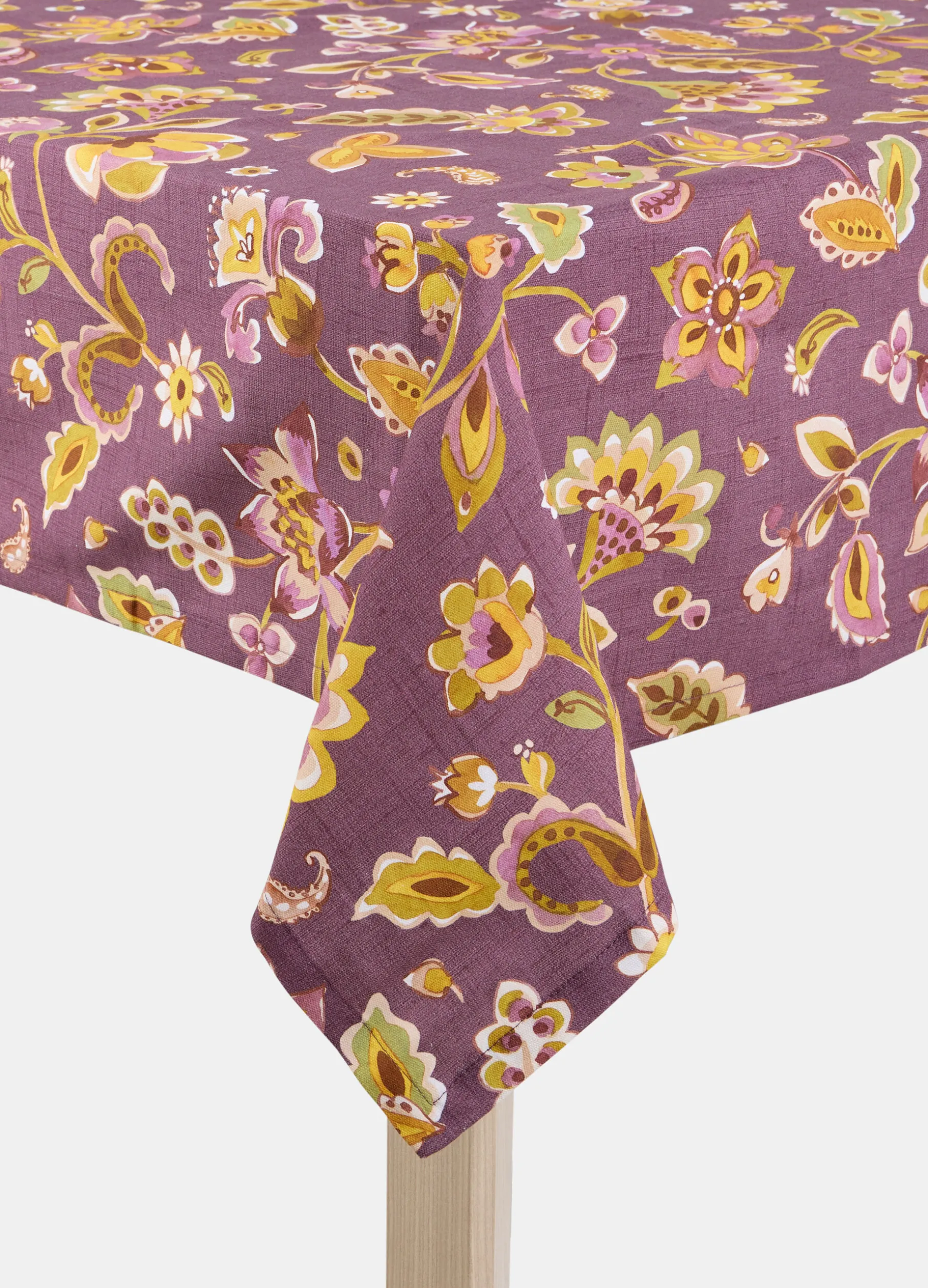 Tovaglia quadrata da quattro persone in puro cotone viola intenso, arricchita dalla colorazione vivace e da una stampa digitale a contrasto nei toni del giallo e dell’arancione. Il tessuto naturale e resistente la rende versatile e adatta all’uso quotidiano. Dimensioni: 140 x 140 cm.