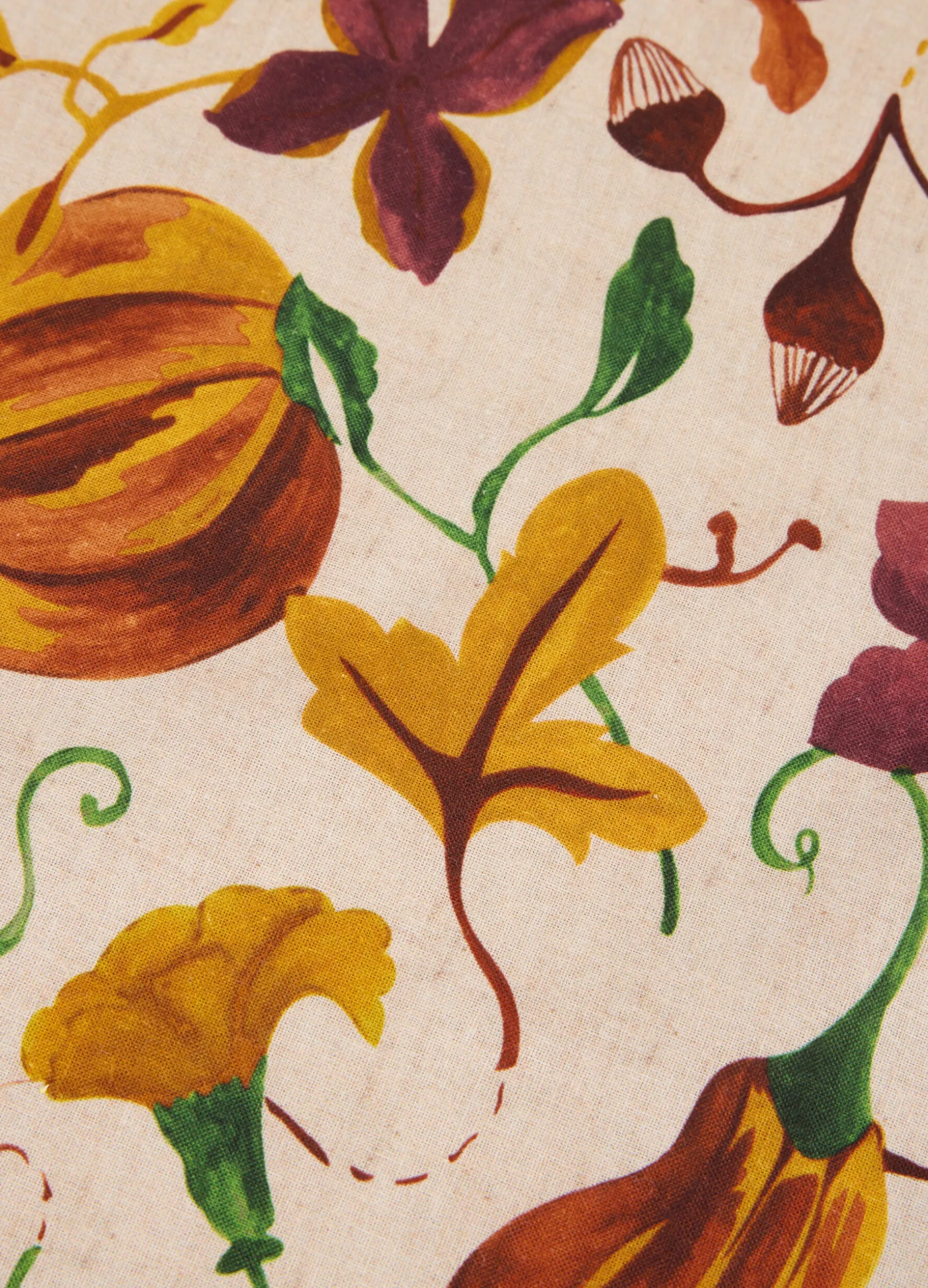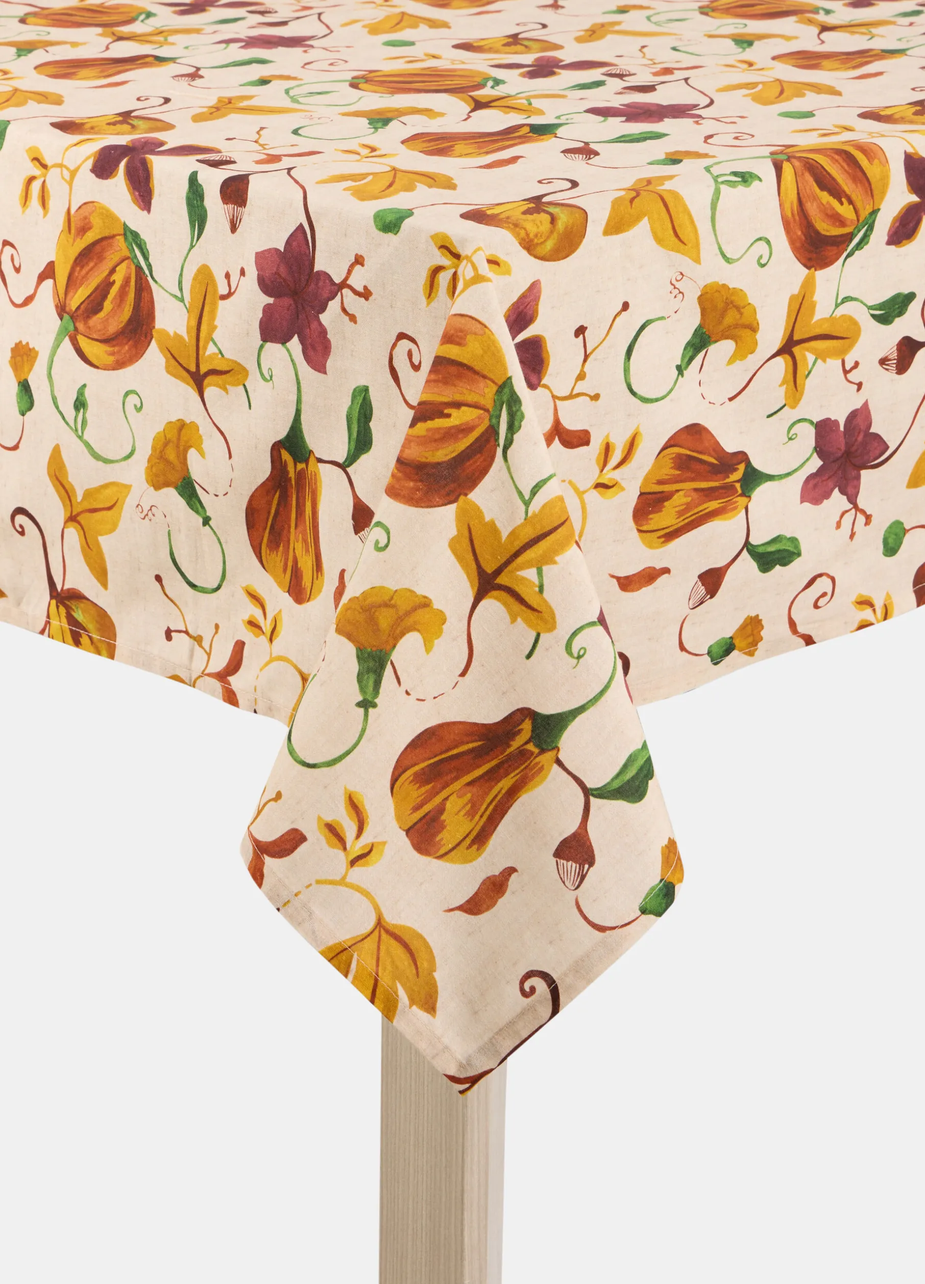 Tovaglia da cucina rettangolare realizzata in puro cotone bianco e arricchita da un motivo autunnale realizzato con stampa digitale che riproduce gli ortaggi e i colori tipici di questa stagione. Dimensioni: 180 x 140 cm.