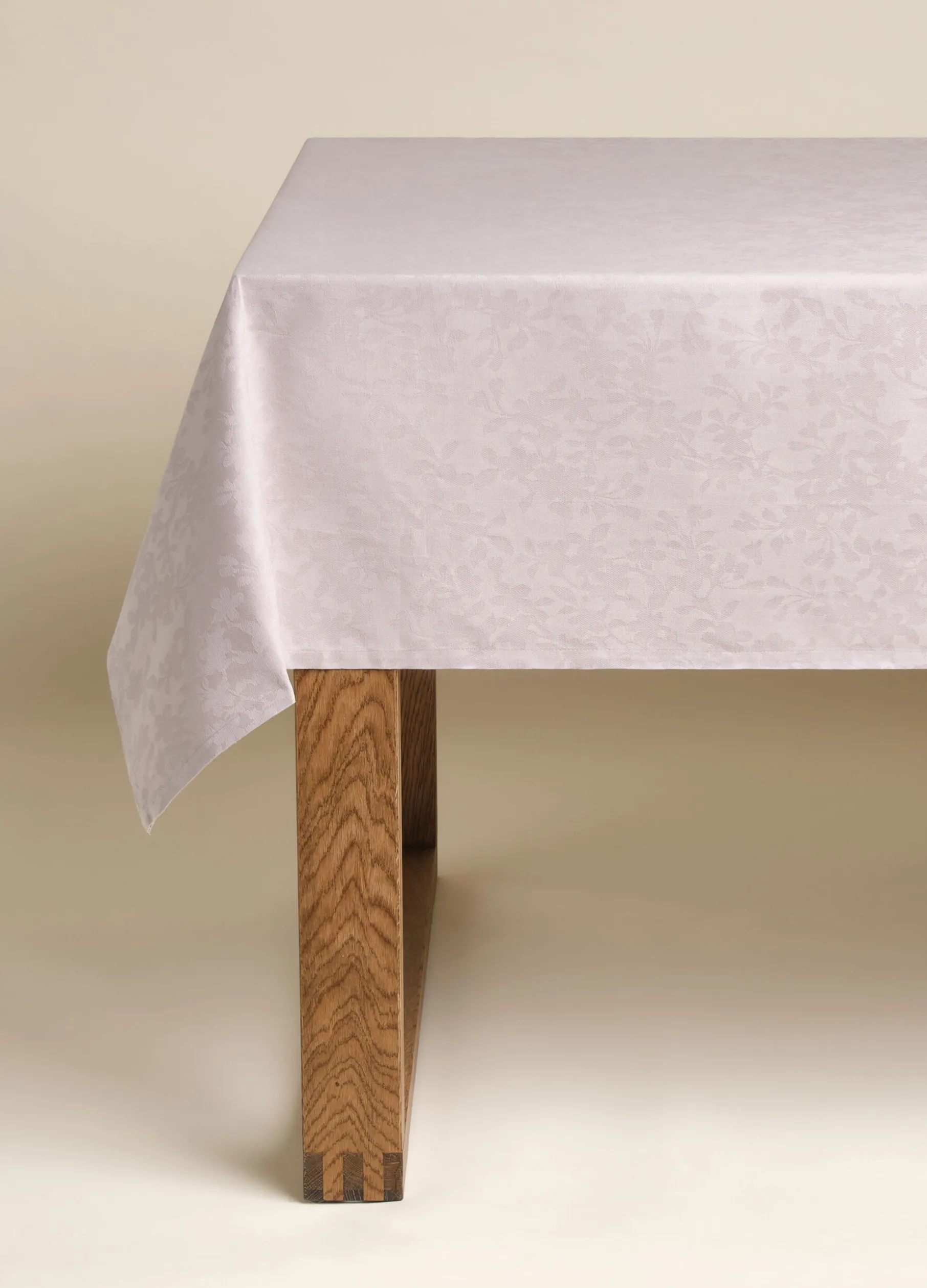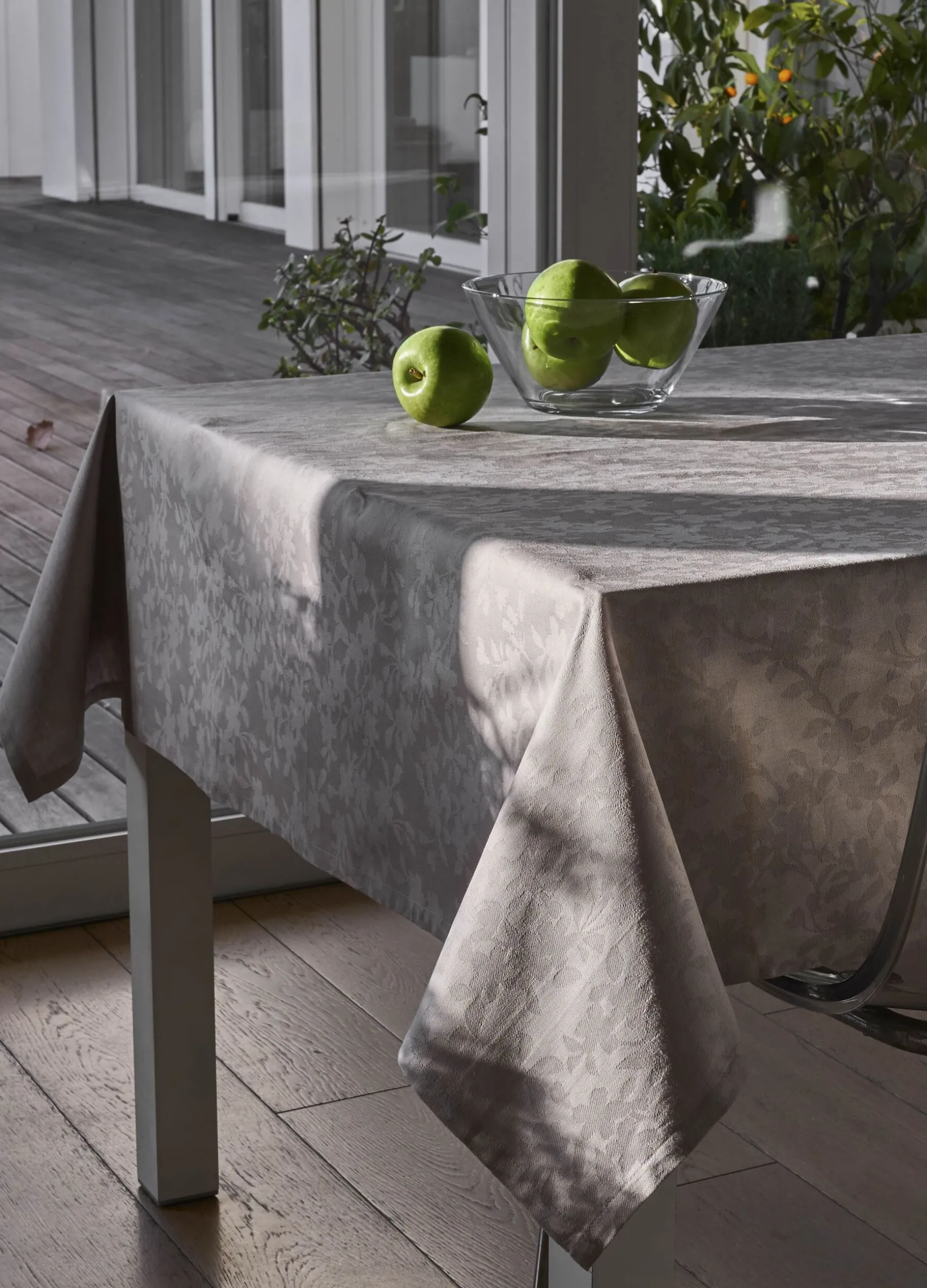 Tovaglia rettangolare da sei posti in puro cotone grigio tortora attraversata all-over da un motivo floreale tono su tono con lavorazione jacquard.