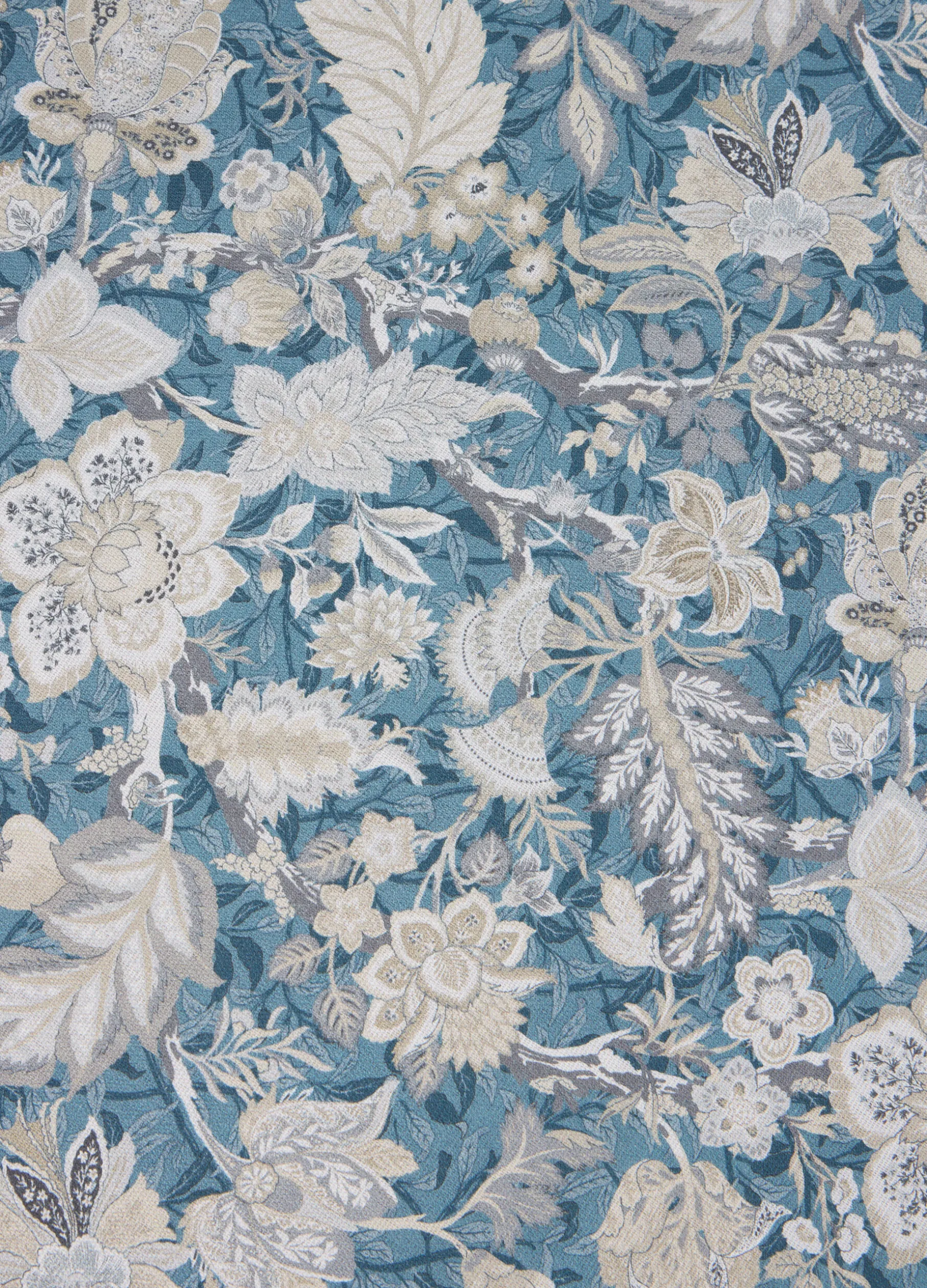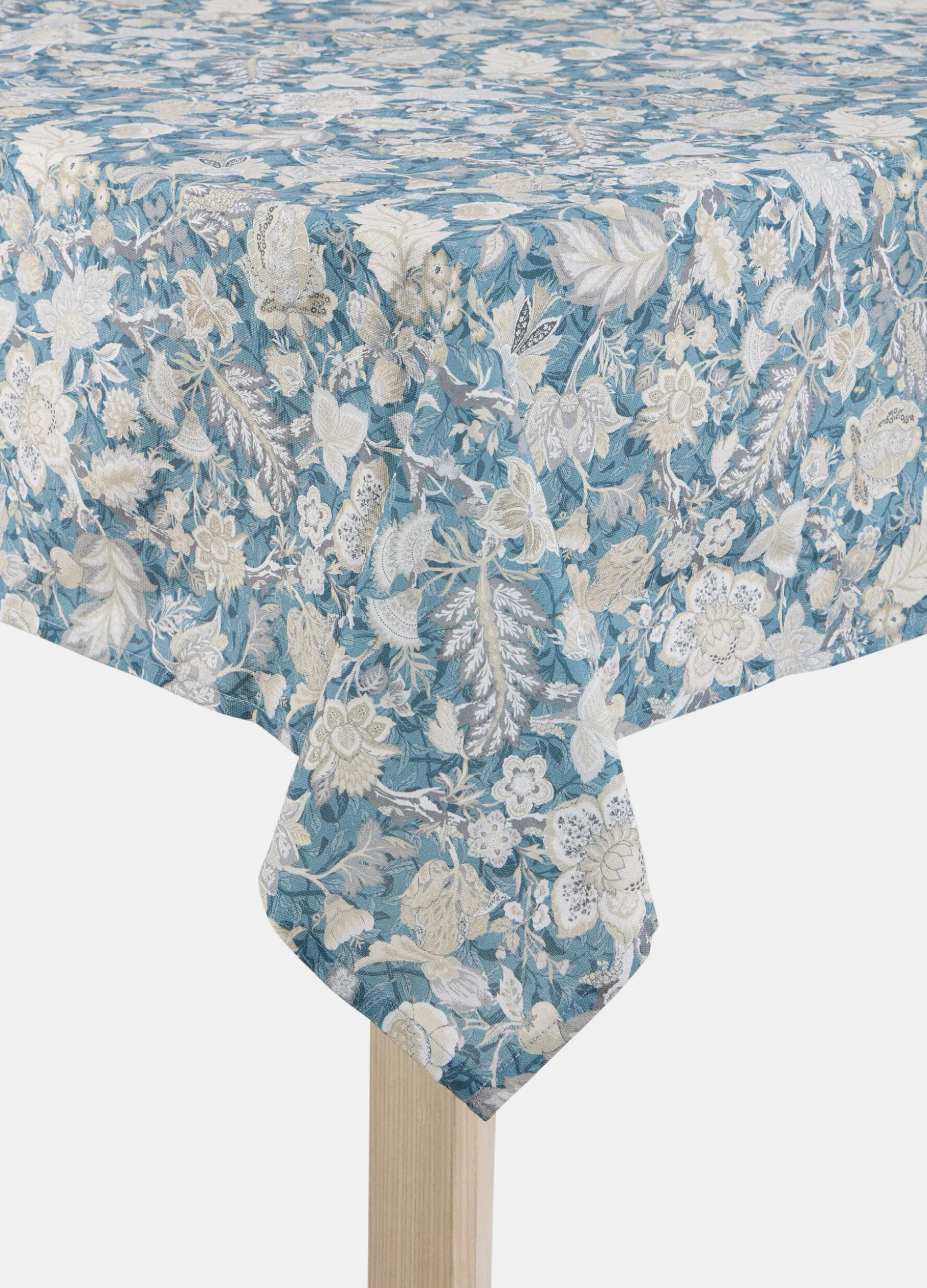 Tovaglia da cucina rettangolare, ideale per tavoli da otto, realizzata in puro cotone, un materiale naturale e resistente che assicura un aspetto elegante e un uso duraturo. La stampa digitale a fiori su fondo azzurro ricorda i motivi broccati degli arazzi. Dimensioni: 240 x 140 cm.