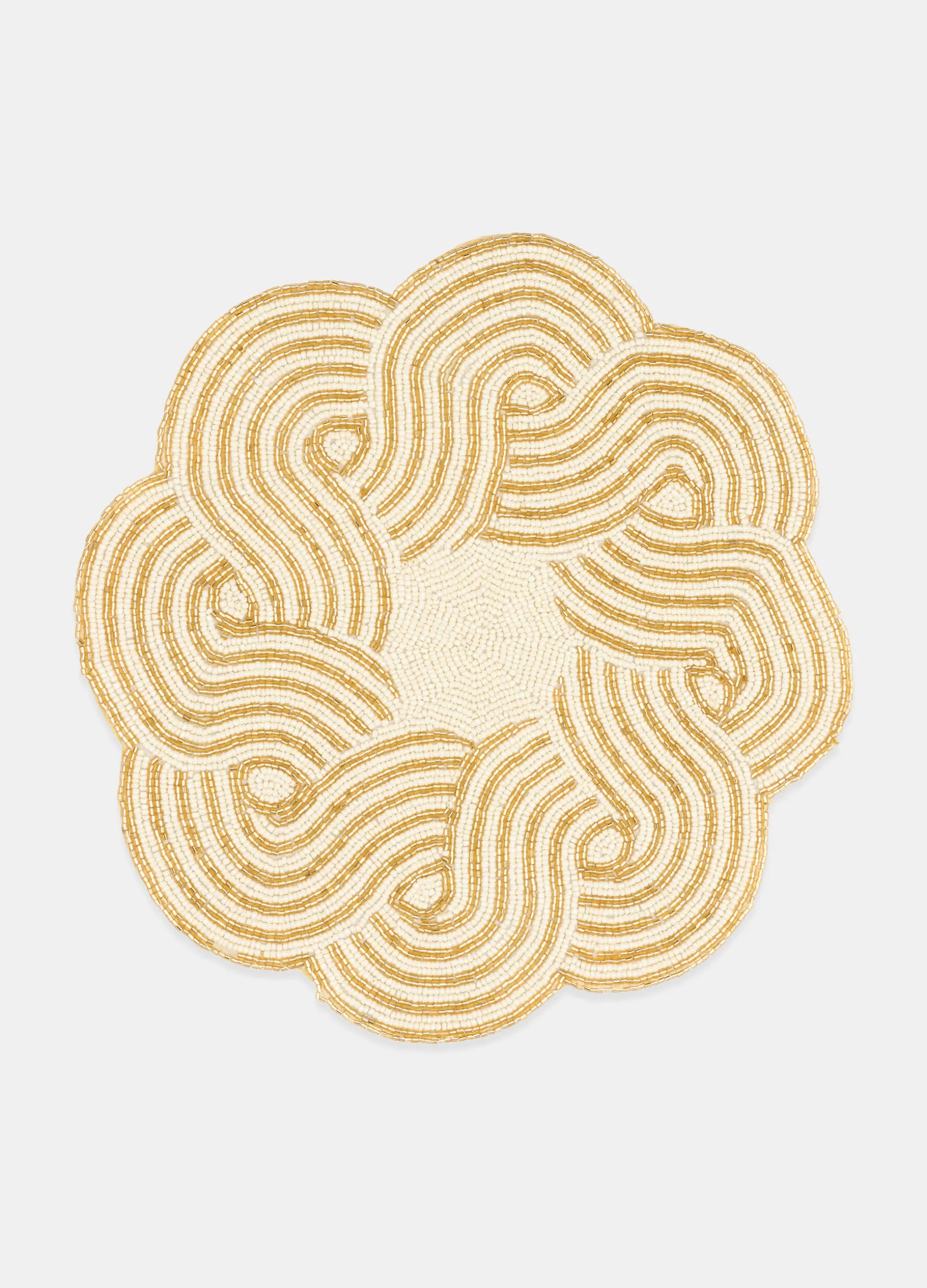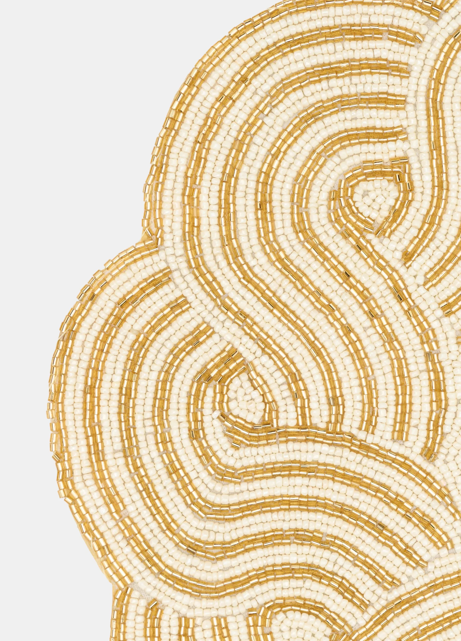 Tovaglietta americana rotonda rivestita di perline colorate. La decorazione forma in intreccio di linee dorate sullo sfondo bianco avorio. Diametro: 36 cm.