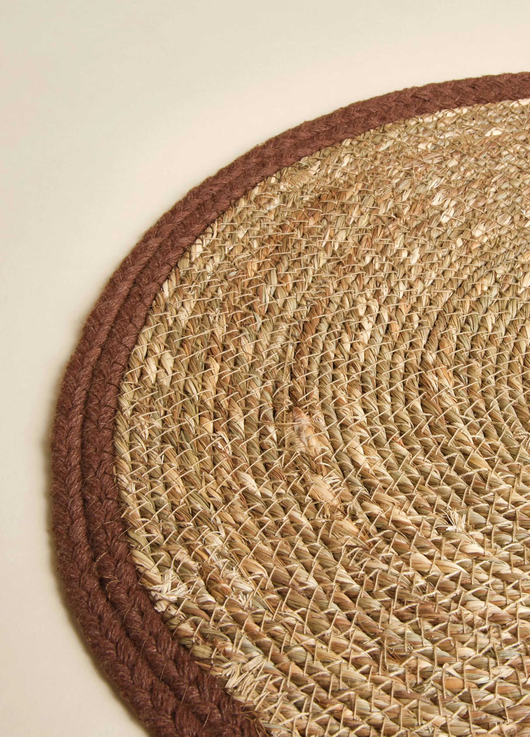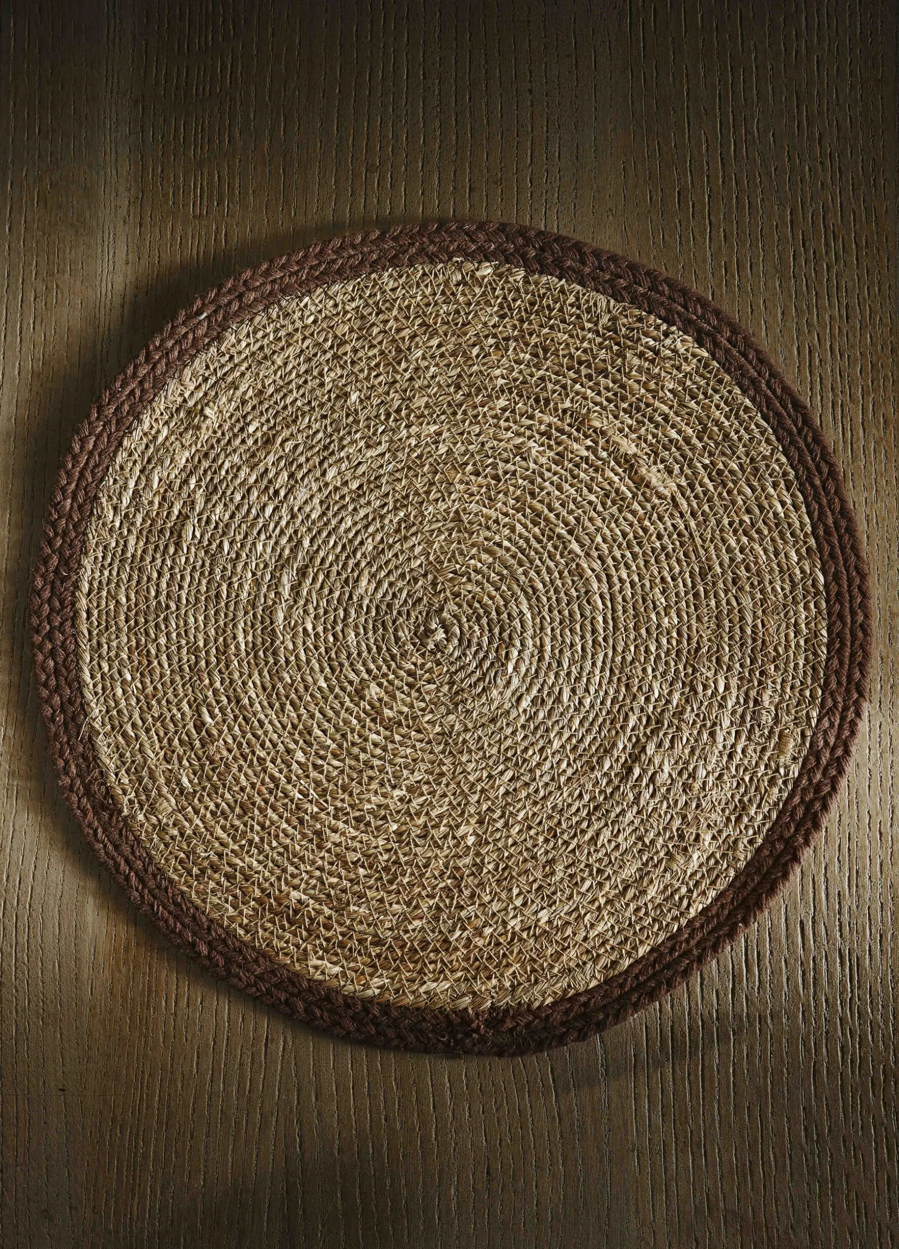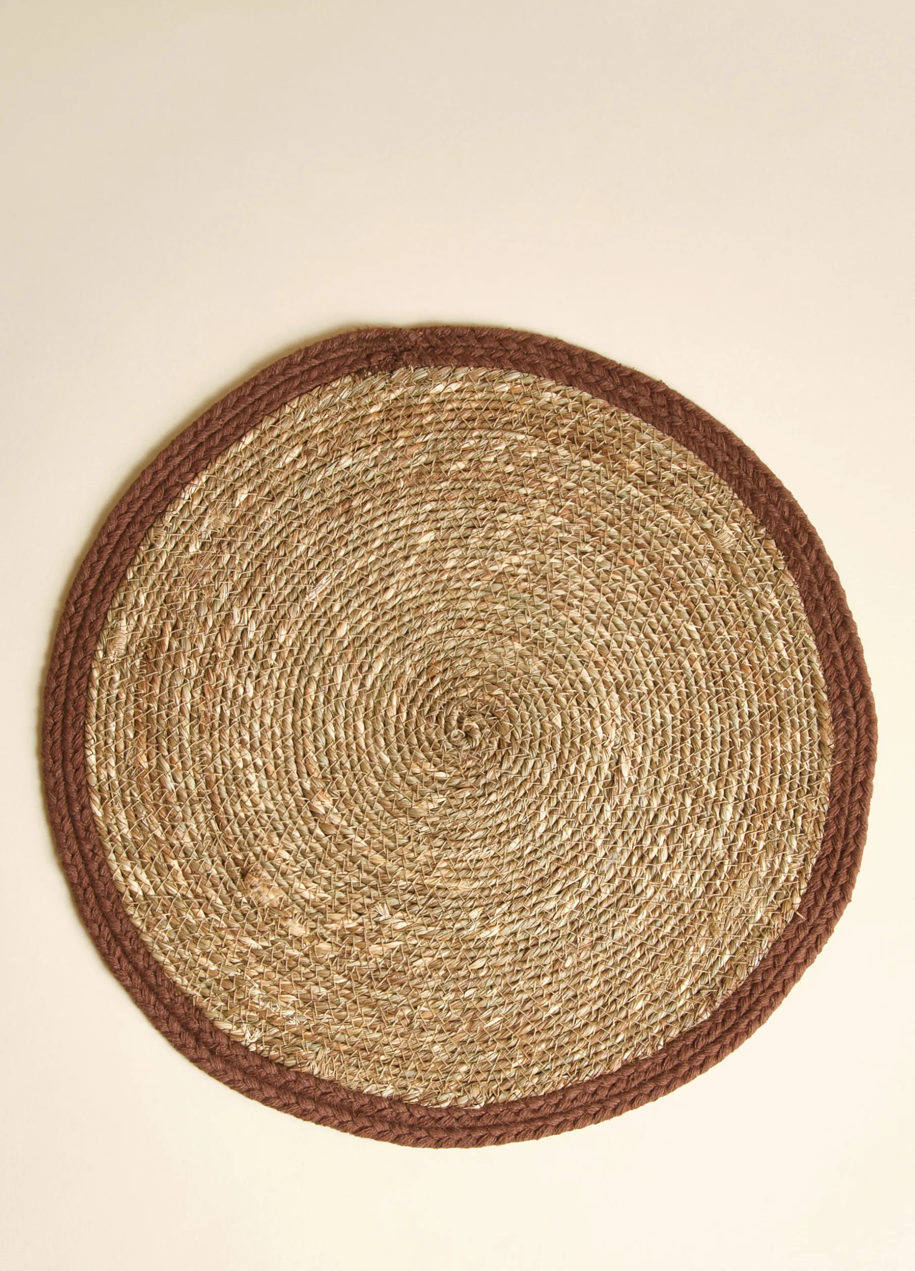 Tovaglietta americana rotonda realizzata intrecciando a spirale le fibre grezze di juta e completata da un bordo in cotone in tonalità più scura.