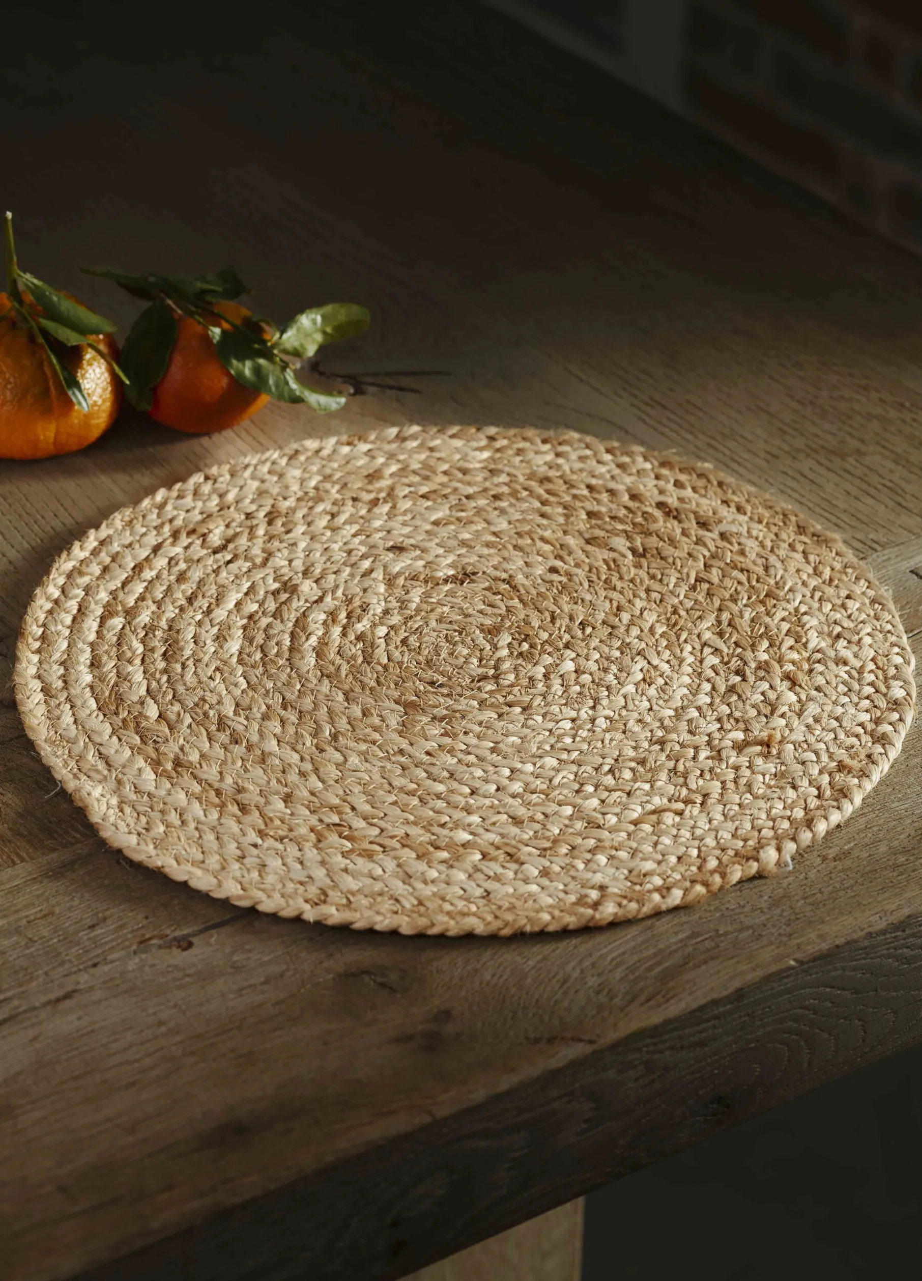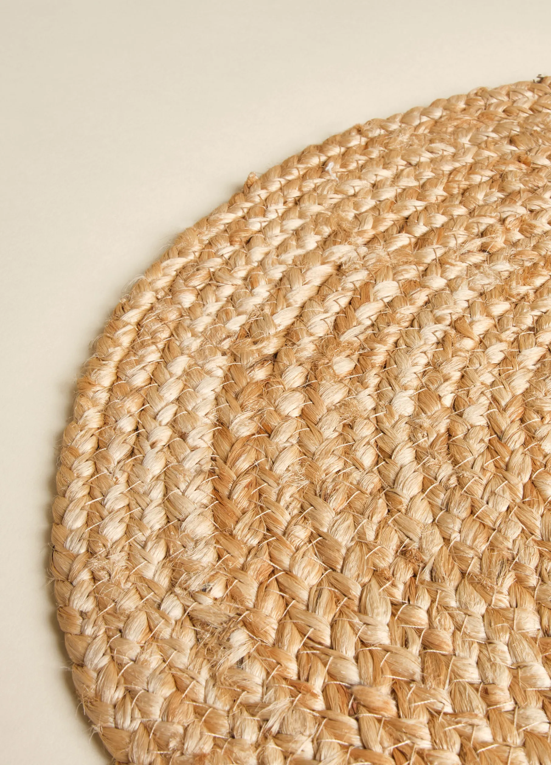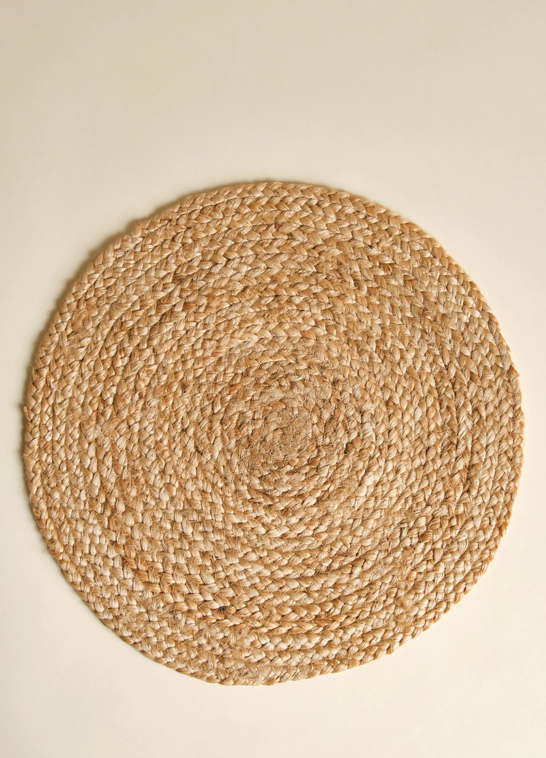 Tovaglietta americana rotonda realizzata intrecciando a spirale le fibre grezze di juta per un look accogliente e semplice. Diametro: 35 cm.