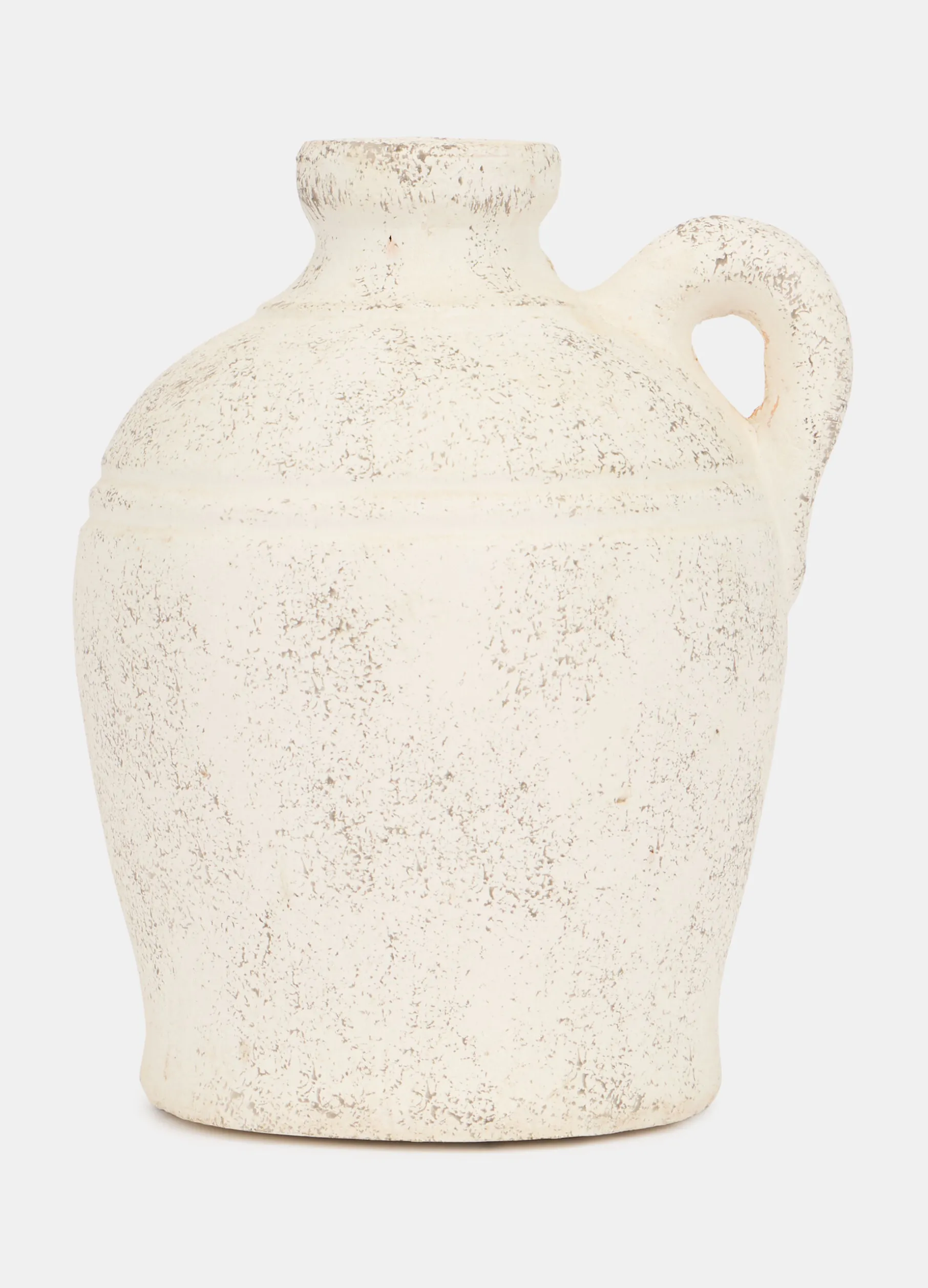 Vaso di media grandezza dal gusto rustico e tradizionale, realizzato in ceramica bianco sporco e rifinito con screziature in colore a contrasto. Dimensioni: 22,5 x 18,5; capacità: 1 L.
